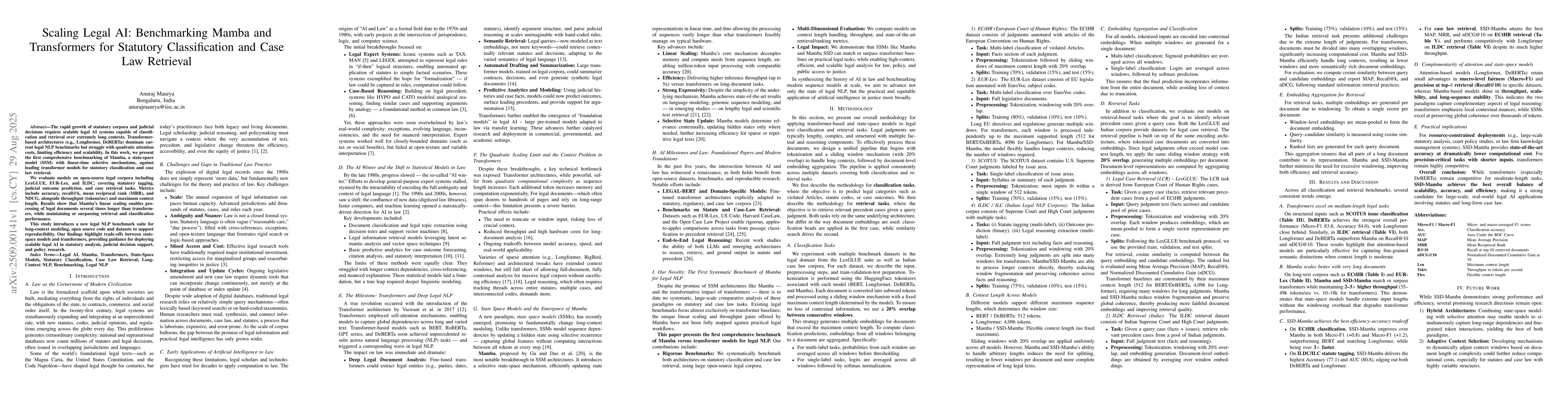 The rapid growth of statutory corpora and judicial decisions requires scalable legal AI systems capable of classification and retrieval over extremely long contexts. Transformer-based architectures (e.g., Longformer, DeBERTa) dominate current legal NLP benchmarks but struggle with quadratic attention costs, limiting efficiency and scalability. In this work, we present the first comprehensive benchmarking of Mamba, a state-space model (SSM) with linear-time selective mechanisms, against leading transformer models for statutory classification and case law retrieval. We evaluate models on open-source legal corpora including LexGLUE, EUR-Lex, and ILDC, covering statutory tagging, judicial outcome prediction, and case retrieval tasks. Metrics include accuracy, recall at k, mean reciprocal rank (MRR), and normalized discounted cumulative gain (nDCG), alongside throughput measured in tokens per second and maximum context length. Results show that Mamba's linear scaling enables processing of legal documents several times longer than transformers, while maintaining or surpassing retrieval and classification performance. This study introduces a new legal NLP benchmark suite for long-context modeling, along with open-source code and datasets to support reproducibility. Our findings highlight trade-offs between state-space models and transformers, providing guidance for deploying scalable legal AI in statutory analysis, judicial decision support, and policy research.