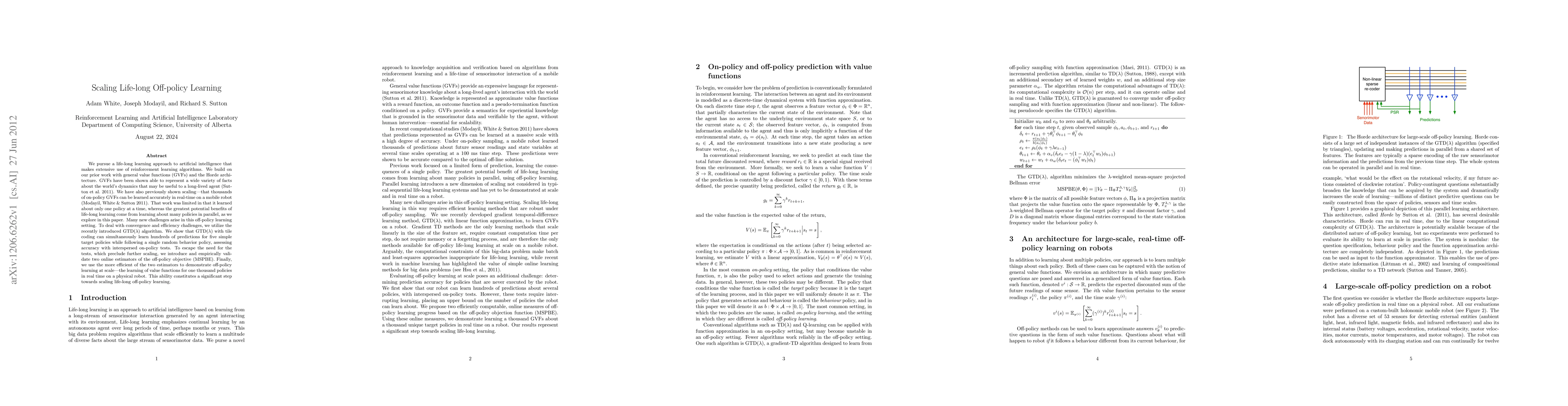 This paper explores scaling life-long off-policy learning in reinforcement learning, leveraging general value functions and the Horde architecture. It introduces online estimators for the off-policy objective and demonstrates the learning of value functions for one thousand policies in real-time on a mobile robot, marking a significant advancement in the field.