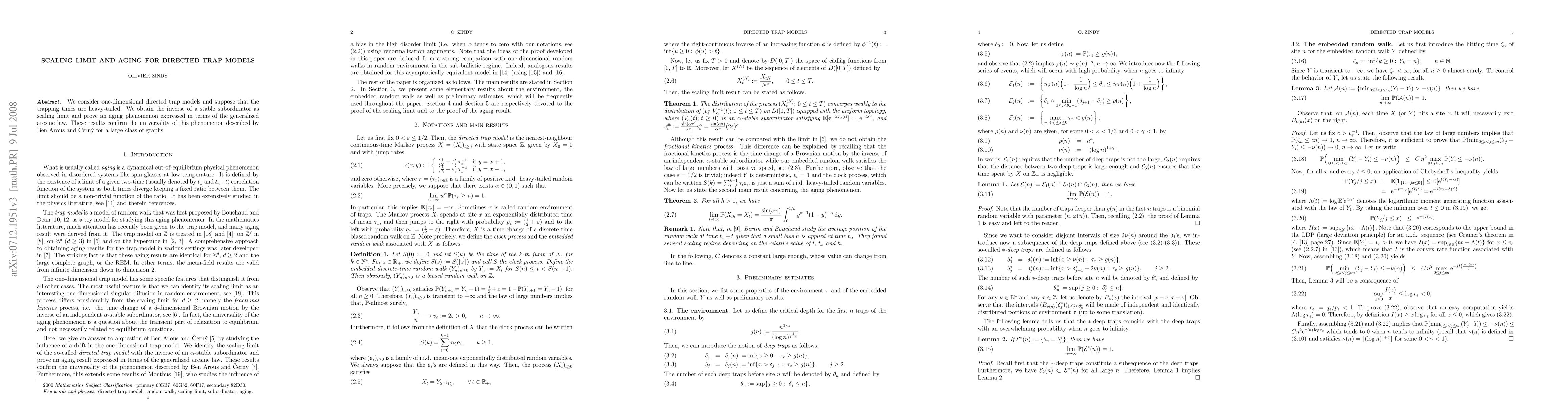 Summary: The research examines one-dimensional directed trap models with heavy-tailed trapping times, revealing a scaling limit of an inverse stable subordinator and an aging phenomenon governed by the generalized arcsine law, supporting universality across a broad range of graph structures.
