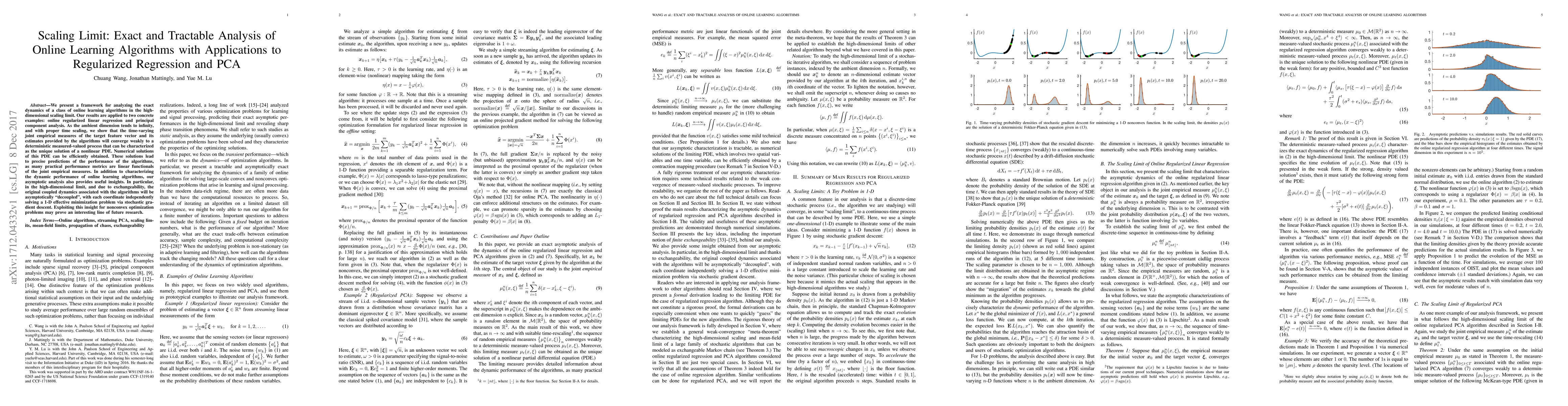 We present a framework for analyzing the exact dynamics of a class of online learning algorithms in the high-dimensional scaling limit. Our results are applied to two concrete examples: online regularized linear regression and principal component analysis. As the ambient dimension tends to infinity, and with proper time scaling, we show that the time-varying joint empirical measures of the target feature vector and its estimates provided by the algorithms will converge weakly to a deterministic measured-valued process that can be characterized as the unique solution of a nonlinear PDE. Numerical solutions of this PDE can be efficiently obtained. These solutions lead to precise predictions of the performance of the algorithms, as many practical performance metrics are linear functionals of the joint empirical measures. In addition to characterizing the dynamic performance of online learning algorithms, our asymptotic analysis also provides useful insights. In particular, in the high-dimensional limit, and due to exchangeability, the original coupled dynamics associated with the algorithms will be asymptotically "decoupled", with each coordinate independently solving a 1-D effective minimization problem via stochastic gradient descent. Exploiting this insight for nonconvex optimization problems may prove an interesting line of future research.