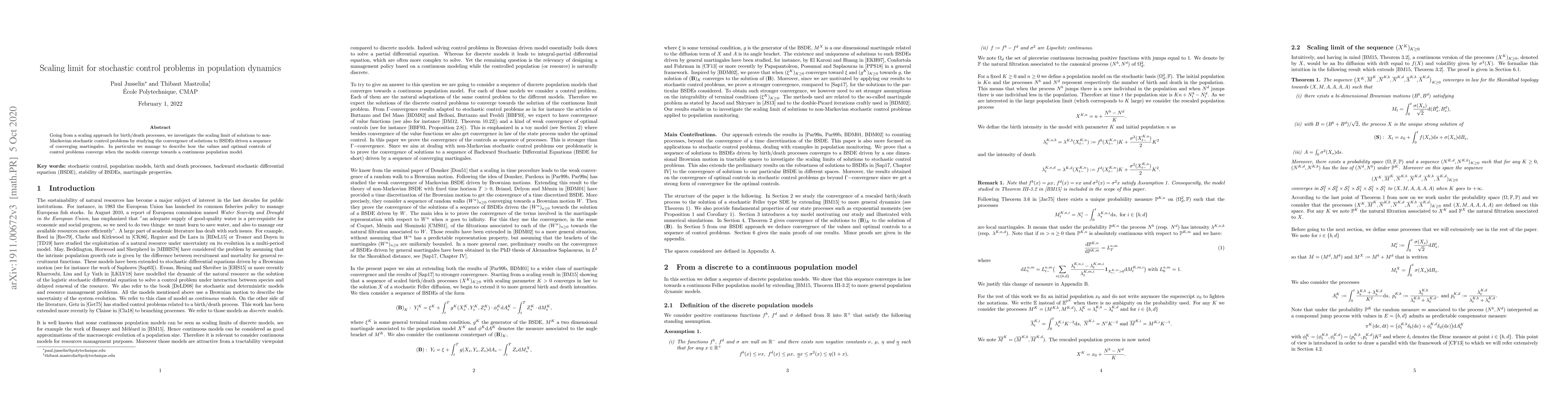 This paper investigates how stochastic control problems in population dynamics converge to a continuous model as the models become more detailed. It finds that solutions to these problems can be described using Backward Stochastic Differential Equations (BSDEs) driven by converging martingales.