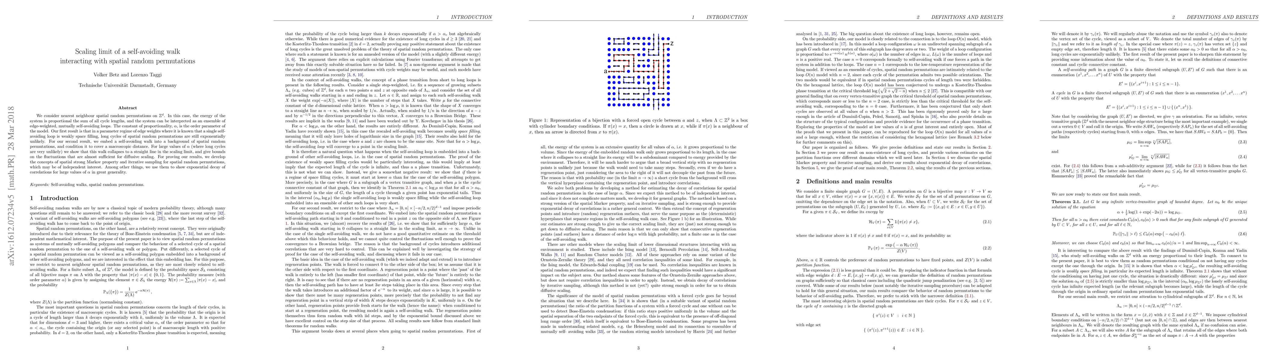 This paper studies the scaling limit of self-avoiding walks interacting with spatial random permutations, showing that under certain conditions, the walk collapses to a straight line. It develops new concepts like spatial strong Markov property and iterative sampling for spatial random permutations to prove results on exponential decay of correlations.