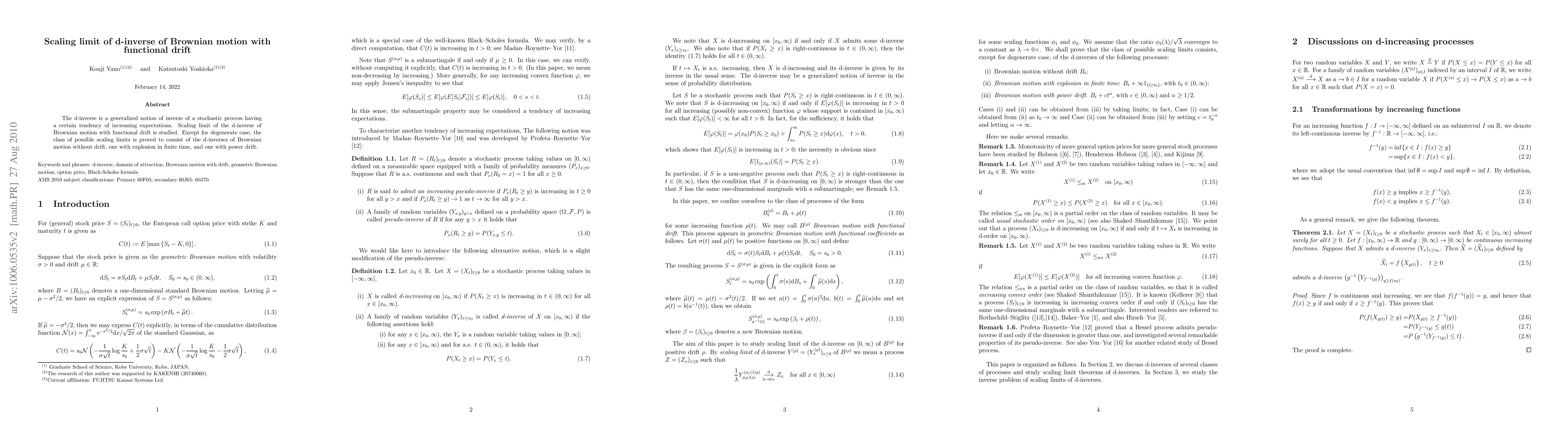 This paper investigates the scaling limit behavior of the d-inverse of Brownian motion with functional drift. It proves that, excluding degenerate cases, the possible scaling limits include d-inverses of Brownian motion without drift, one with finite-time explosion, and one with power drift.