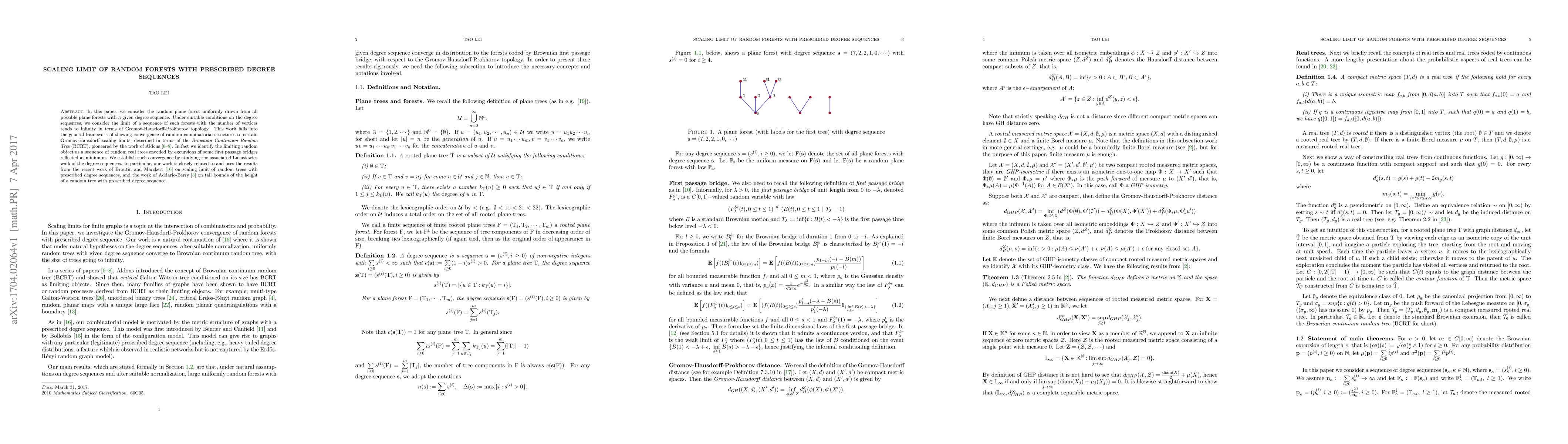 This paper investigates the scaling limit of random plane forests with prescribed degree sequences, showing convergence to a Brownian Continuum Random Tree under suitable conditions, and establishing this through the associated Lukasiewicz walk and results from recent studies on random trees and degree sequences.