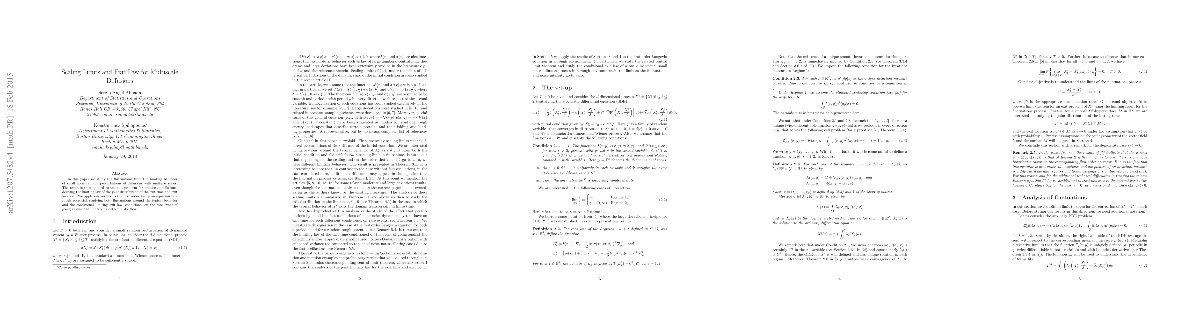 The paper presents a scaling limit analysis for multiscale diffusions with small noise, deriving the exit law for these systems, which extends previous work on homogenization and large deviations.