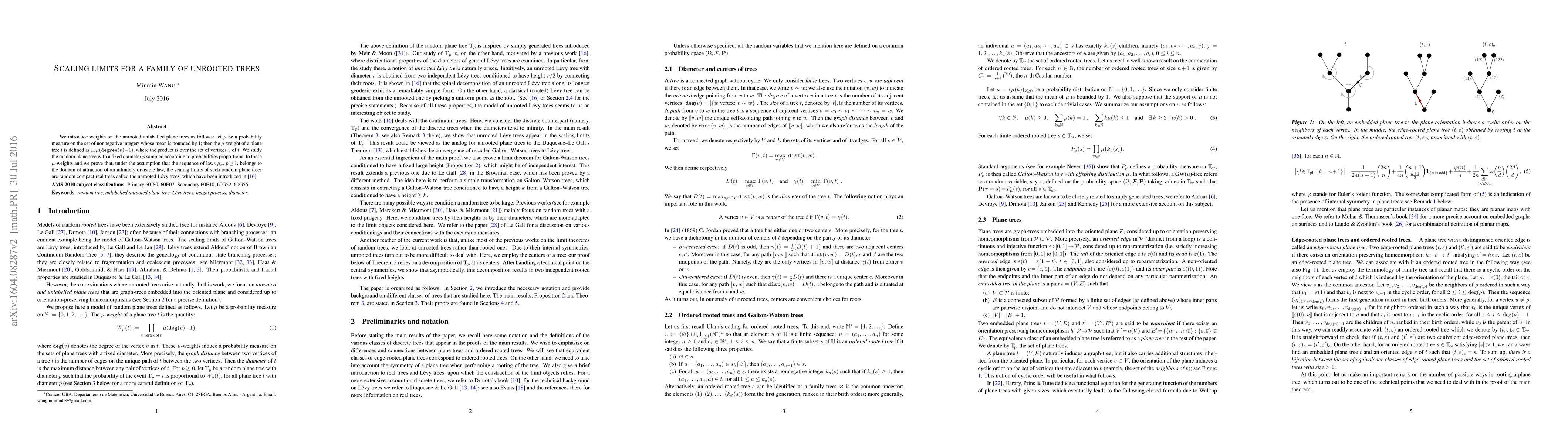 We introduce weights on the unrooted unlabelled plane trees as follows: let $\mu$ be a probability measure on the set of nonnegative integers whose mean is no larger than $1$; then the $\mu$-weight of a plane tree $t$ is defined as $\Pi \, \mu (degree (v) -1)$, where the product is over the set of vertices $v$ of $t$. We study the random plane tree with a fixed diameter $p$ sampled according to probabilities proportional to these $\mu$-weights and we prove that, under the assumption that the sequence of laws $\mu_p$, $p\! \geq \! 1$, belongs to the domain of attraction of an infinitely divisible law, the scaling limits of such random plane trees are random compact real trees called the unrooted Levy trees, which have been introduced in Duquense & Wang.