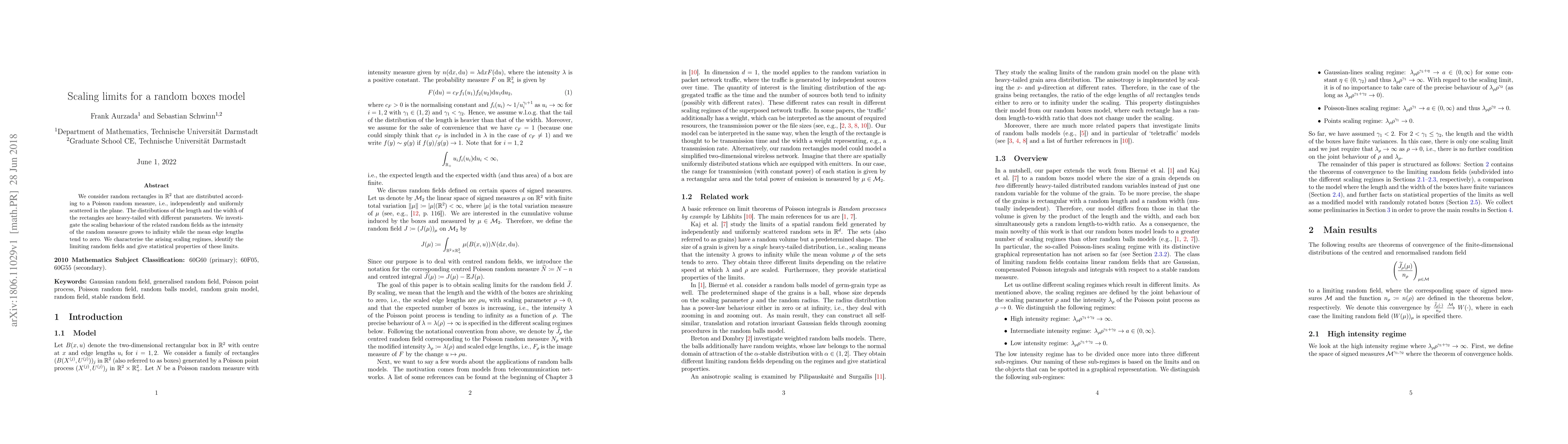 This study investigates how random rectangles in 2D space behave as their size scales with an increasing intensity of scattered points, revealing different scaling regimes and limiting random fields.