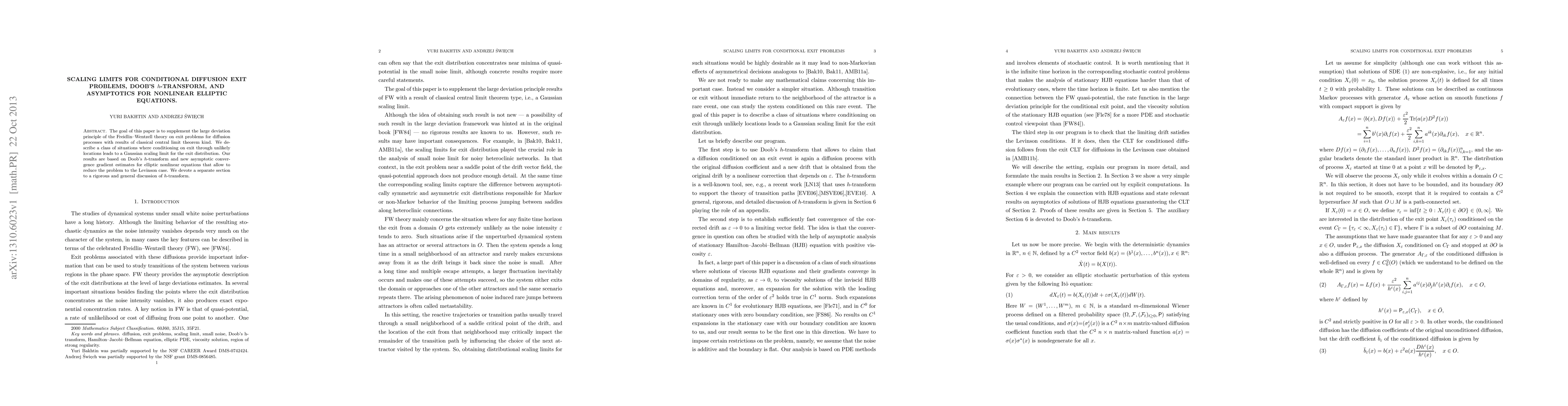 This paper explores scaling limits for conditional diffusion exit problems using Doob's h-transform, demonstrating Gaussian limits for exit distributions conditioned on unlikely locations. It also introduces new asymptotic gradient estimates for nonlinear elliptic equations to facilitate the reduction to the Levinson case.