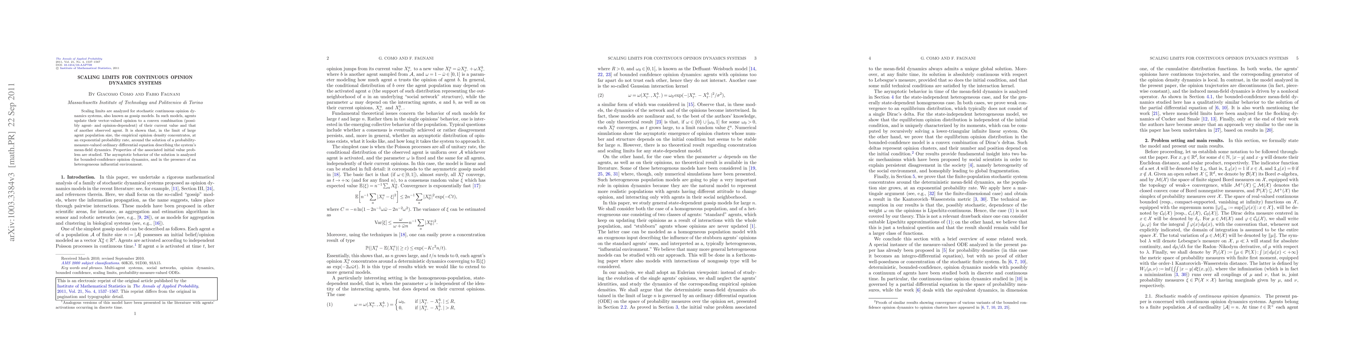 This paper investigates the scaling limits of stochastic continuous opinion dynamics systems, demonstrating that as the number of agents grows large, the empirical opinion density converges exponentially to the solution of a mean-field ordinary differential equation. The study also examines the bounded-confidence dynamics and the impact of a heterogeneous influential environment on the system's asymptotic behavior.