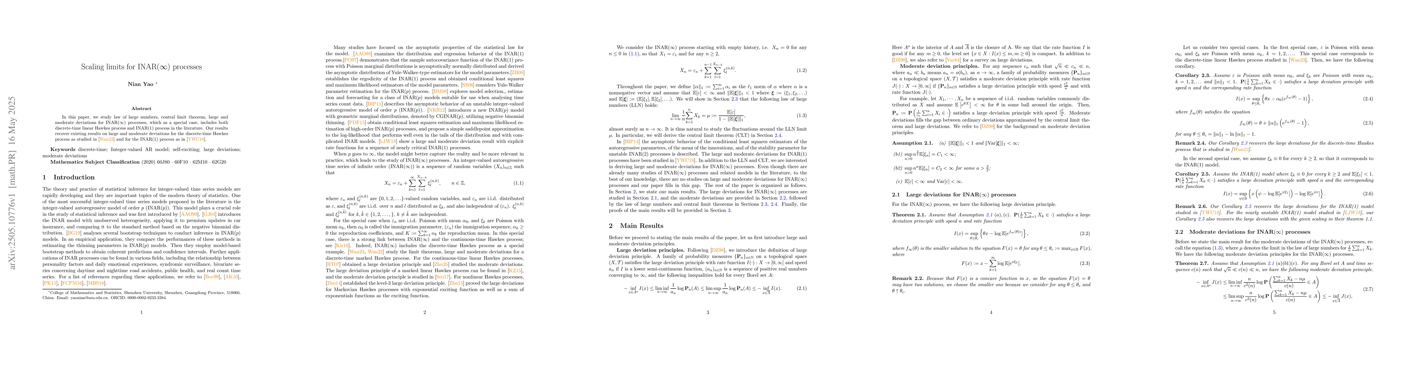 This paper investigates scaling limits for INAR($ extit{π}$) processes, including the discrete-time linear Hawkes process and INAR(1) process, recovering existing results on law of large numbers, central limit theorem, and deviations.