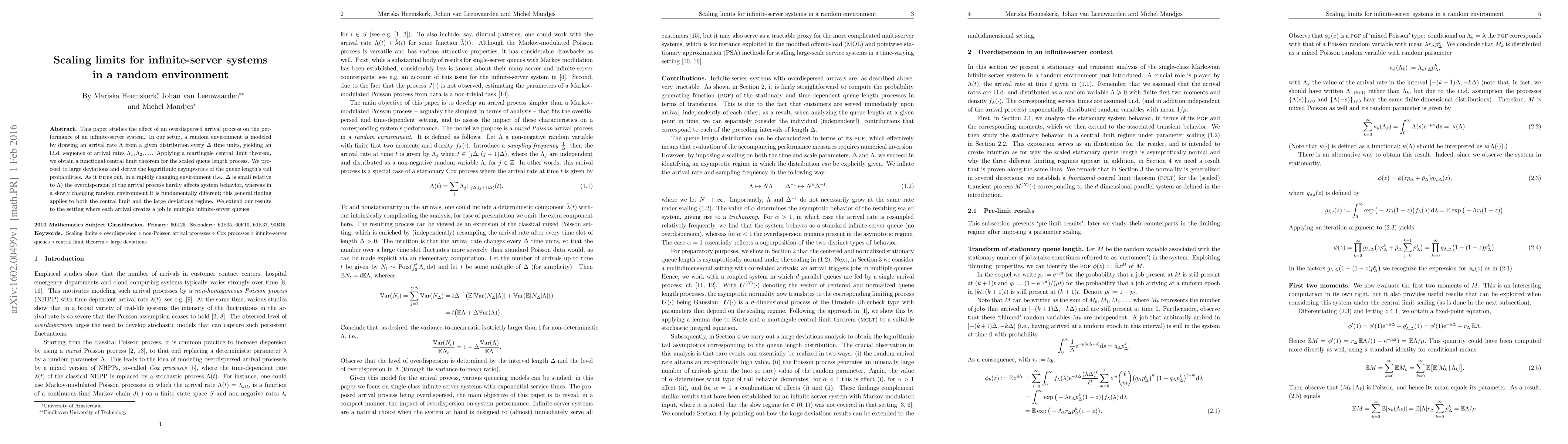 This paper studies the effect of an overdispersed arrival process on the performance of an infinite-server system. In our setup, a random environment is modeled by drawing an arrival rate $\Lambda$ from a given distribution every $\Delta$ time units, yielding an i.i.d. sequence of arrival rates $\Lambda_1,\Lambda_2, \ldots$. Applying a martingale central limit theorem, we obtain a functional central limit theorem for the scaled queue length process. We proceed to large deviations and derive the logarithmic asymptotics of the queue length's tail probabilities. As it turns out, in a rapidly changing environment (i.e., $\Delta$ is small relative to $\Lambda$) the overdispersion of the arrival process hardly affects system behavior, whereas in a slowly changing random environment it is fundamentally different; this general finding applies to both the central limit and the large deviations regime. We extend our results to the setting where each arrival creates a job in multiple infinite-server queues.