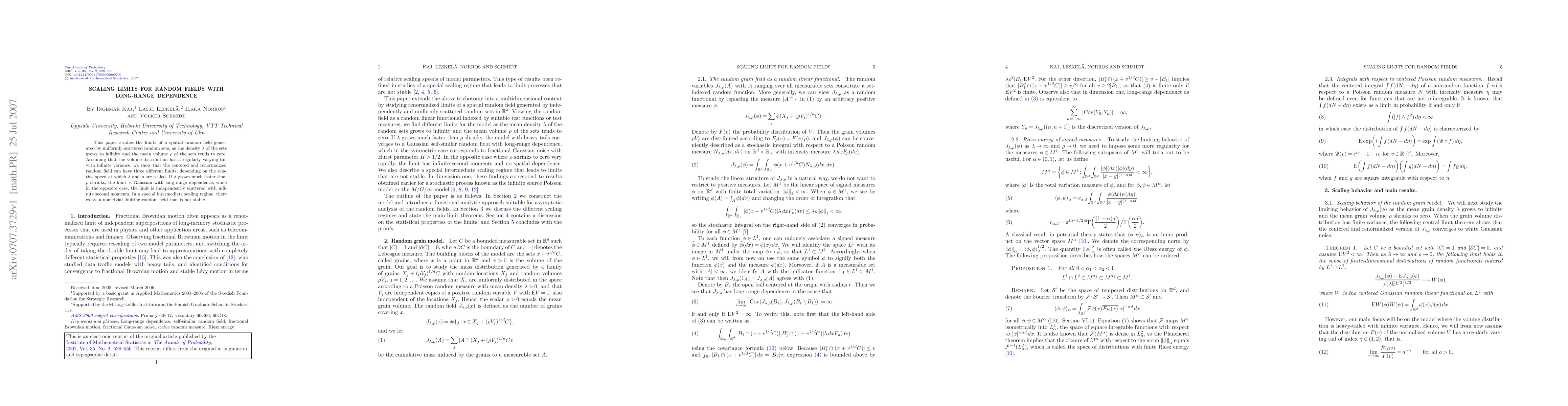 This paper explores the scaling limits of a spatial random field generated by uniformly scattered random sets, demonstrating that the limit depends on the relative scaling of density and mean volume, resulting in Gaussian long-range dependence, independently scattered fields, or a nontrivial non-stable limiting field.