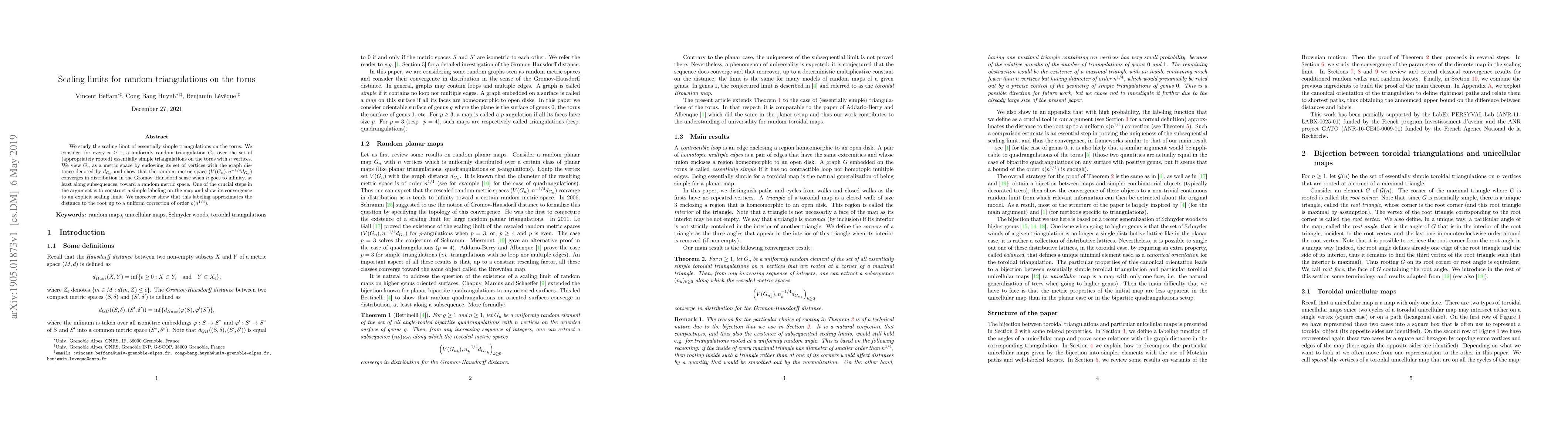 This paper investigates the scaling limit of random triangulations on the torus, demonstrating that a sequence of random metric spaces converges in distribution to a random metric space as the number of vertices increases. The convergence is shown through a carefully constructed labeling that approximates the distance to the root with a uniform correction.