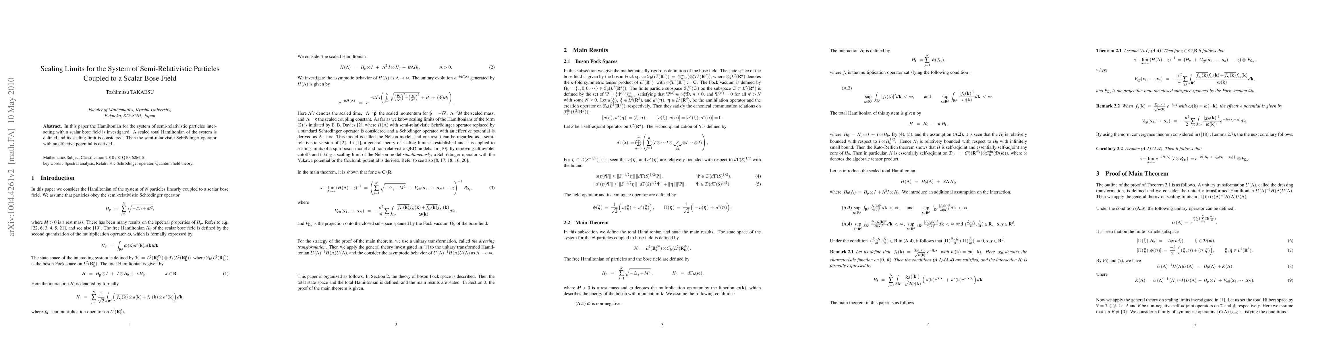 This paper investigates the Hamiltonian for semi-relativistic particles coupled to a scalar Bose field, defining a scaled total Hamiltonian and deriving its scaling limit. It concludes with the derivation of a semi-relativistic Schrödinger operator featuring an effective potential.