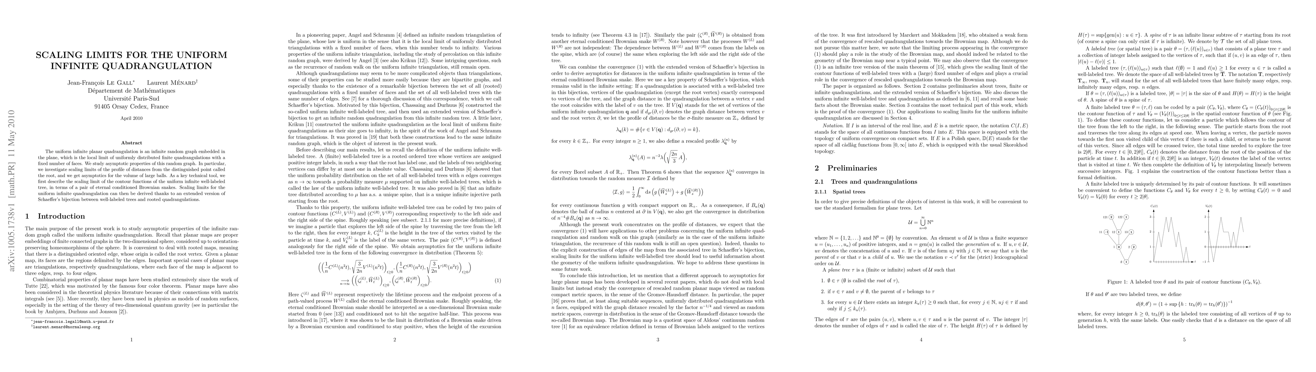 This paper explores the asymptotic properties of the uniform infinite planar quadrangulation, focusing on the scaling limits of distances from a distinguished root point and the volume of large balls. It leverages Schaeffer's bijection and conditioned Brownian snakes to derive these limits.