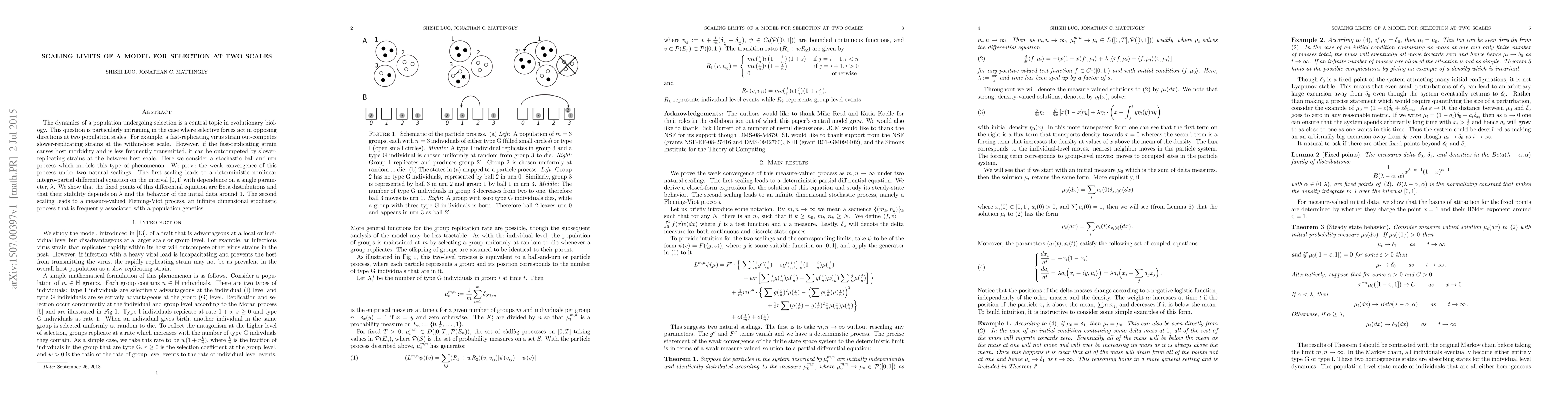 The dynamics of a population undergoing selection is a central topic in evolutionary biology. This question is particularly intriguing in the case where selective forces act in opposing directions at two population scales. For example, a fast-replicating virus strain outcompetes slower-replicating strains at the within-host scale. However, if the fast-replicating strain causes host morbidity and is less frequently transmitted, it can be outcompeted by slower-replicating strains at the between-host scale. Here we consider a stochastic ball-and-urn process which models this type of phenomenon. We prove the weak convergence of this process under two natural scalings. The first scaling leads to a deterministic nonlinear integro-partial differential equation on the interval $[0,1]$ with dependence on a single parameter, $\lambda$. We show that the fixed points of this differential equation are Beta distributions and that their stability depends on $\lambda$ and the behavior of the initial data around $1$. The second scaling leads to a measure-valued Fleming-Viot process, an infinite dimensional stochastic process that is frequently associated with a population genetics.