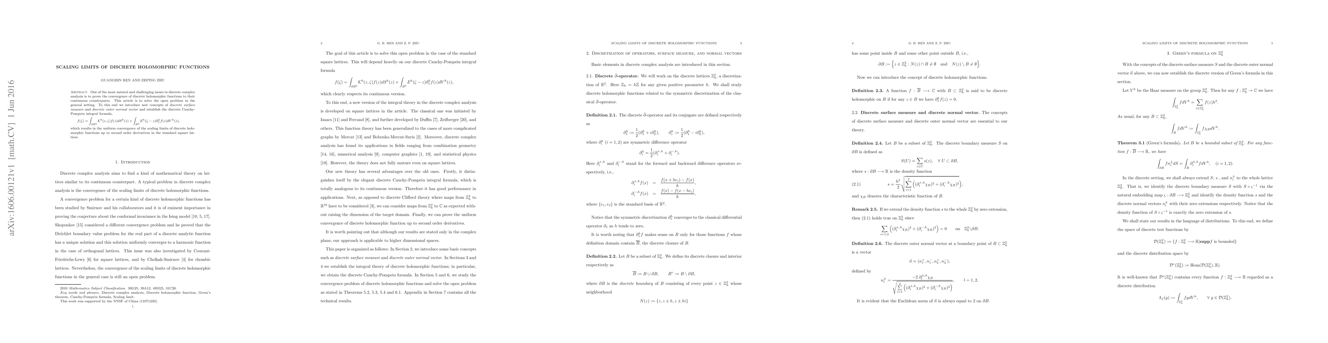 This paper addresses the convergence of discrete holomorphic functions to their continuous counterparts by introducing new concepts of discrete surface measure and discrete outer normal vector. It establishes a discrete Cauchy-Pompeiu integral formula, leading to the uniform convergence of scaling limits of discrete holomorphic functions up to second-order derivatives in standard square lattices.