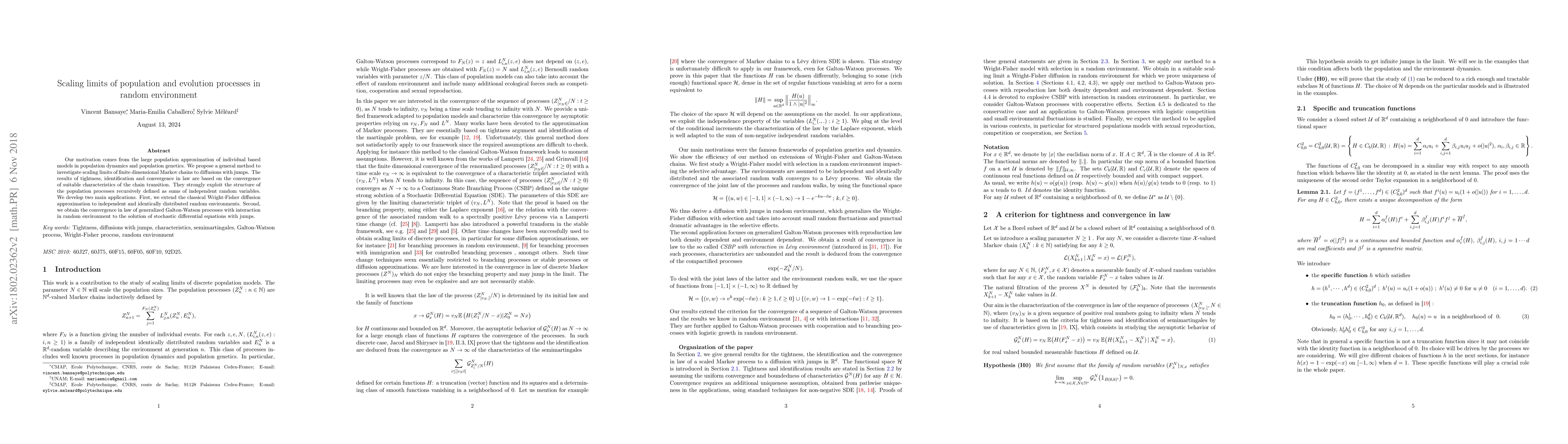 Our motivation comes from the large population approximation of individual based models in population dynamics and population genetics. We propose a general method to investigate scaling limits of finite dimensional population size Markov chains to diffusion with jumps. The statements of tightness, identification and convergence in law are based on the convergence of suitable characteristics of the transition of the chain and strongly exploit the structure of the population processes defined recursively as sums of independent random variables. These results allow to reduce the convergence of characteristics of semimartingales to analytically tractable functional spaces. We develop two main applications. First, we extend the classical Wright-Fisher diffusion approximation to independent and identically distributed random environment. Second, we obtain the convergence in law of generalized Galton-Watson processes with interactions and random environment to the solution of stochastic differential equations with jumps.