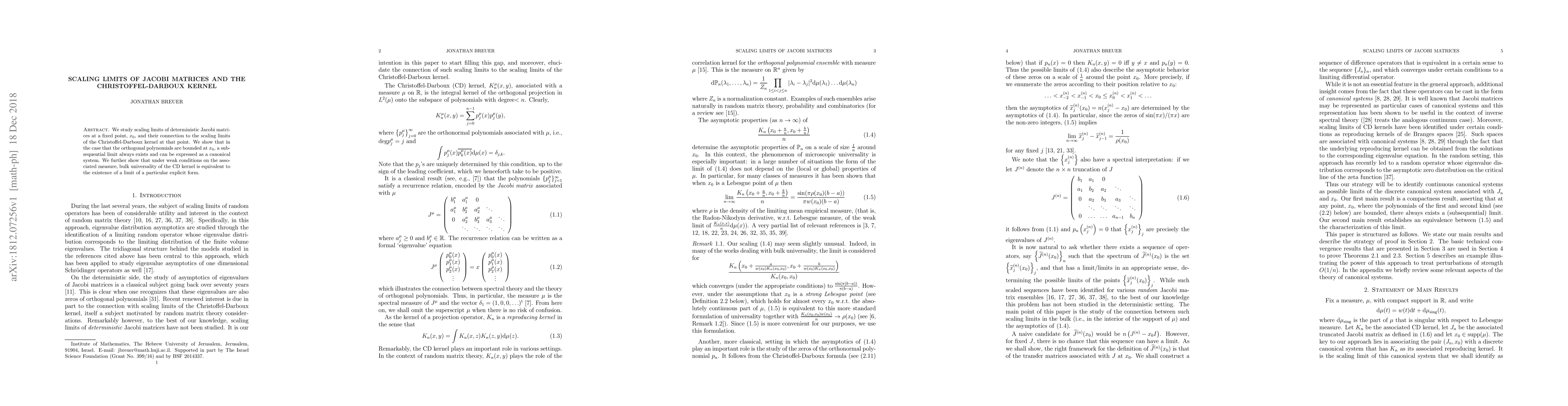This paper investigates the scaling limits of deterministic Jacobi matrices and their Christoffel-Darboux kernels at a fixed point. It demonstrates that when the orthogonal polynomials are bounded at this point, a subsequential limit exists and is expressible as a canonical system, while also linking bulk universality of the kernel to the existence of a specific limit form under mild measure conditions.