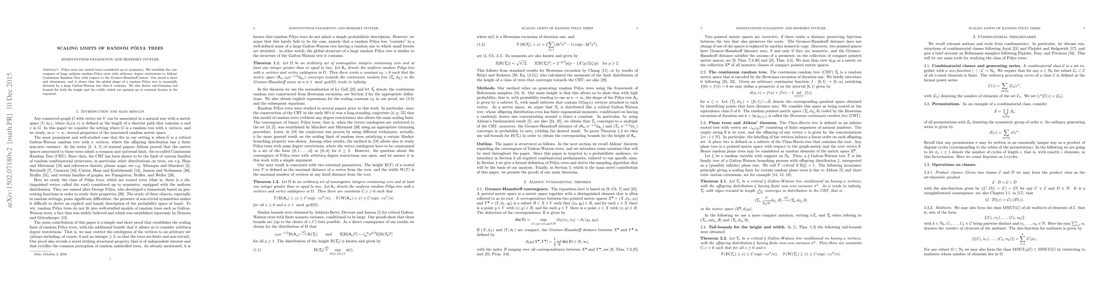 P\'olya trees are rooted trees considered up to symmetry. We establish the convergence of large uniform random P\'olya trees with arbitrary degree restrictions to Aldous' Continuum Random Tree with respect to the Gromov-Hausdorff metric. Our proof is short and elementary, and it shows that the global shape of a random P\'olya tree is essentially dictated by a large Galton-Watson tree that it contains. We also derive sub-Gaussian tail bounds for both the height and the width, which are optimal up to constant factors in the exponent.