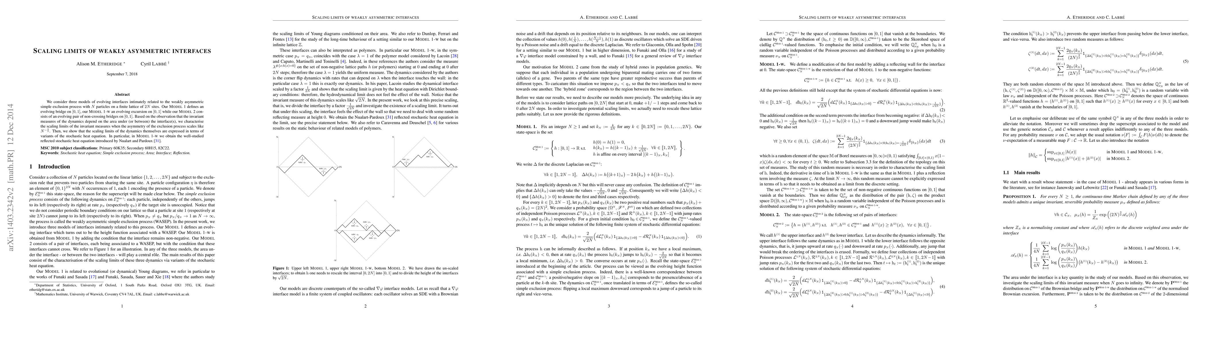 We consider three models of evolving interfaces intimately related to the weakly asymmetric simple exclusion process with $N$ particles on a finite lattice of $2N$ sites. Our Model 1 defines an evolving bridge on $[0,1]$, our Model 1-w an evolving excursion on $[0,1]$ while our Model 2 consists of an evolving pair of non-crossing bridges on $[0,1]$. Based on the observation that the invariant measures of the dynamics depend on the area under (or between) the interface(s), we characterise the scaling limits of the invariant measures when the asymmetry of the exclusion process scales like $N^{-\frac{3}{2}}$. Then, we show that the scaling limits of the dynamics themselves are expressed in terms of variants of the stochastic heat equation. In particular, in Model 1-w we obtain the well-studied reflected stochastic heat equation introduced by Nualart and Pardoux.