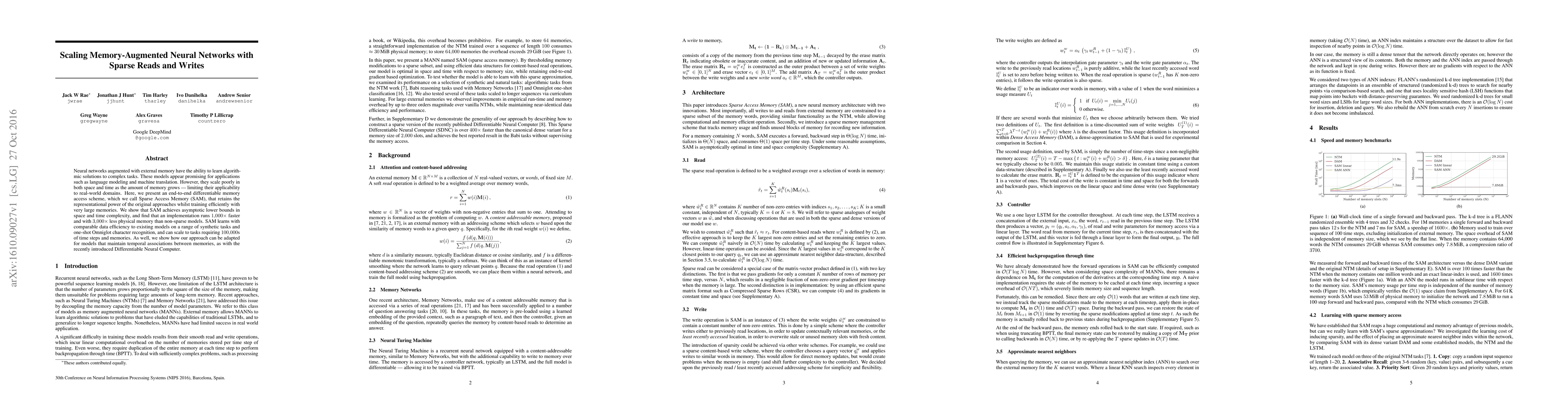 This paper introduces Sparse Access Memory (SAM), a novel memory access scheme for scaling memory-augmented neural networks efficiently. SAM achieves significant improvements in both space and time complexity, enabling the models to handle large memories and tasks requiring many time steps.