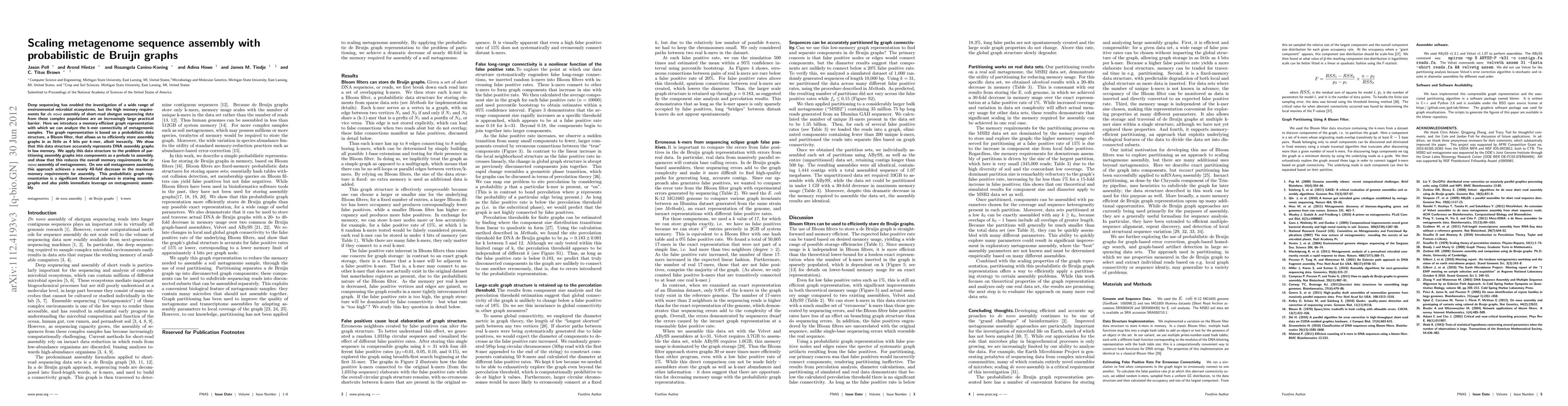 This paper introduces a memory-efficient probabilistic de Bruijn graph using Bloom filters to reduce the memory requirements for assembling metagenome sequences, achieving a nearly 40-fold decrease in memory usage for one soil metagenome assembly.
