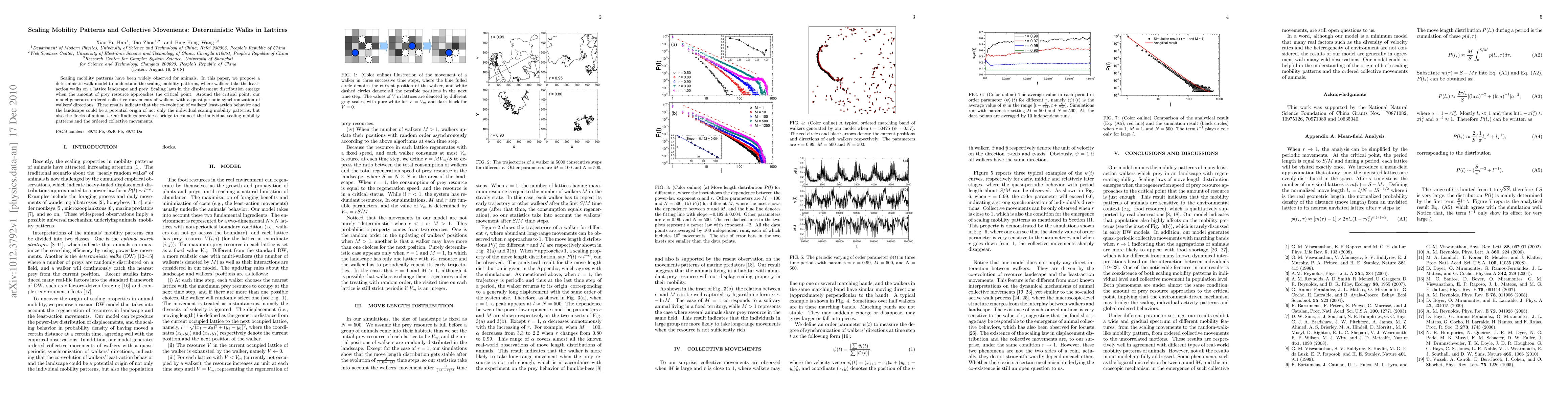 This paper proposes a deterministic walk model to explore scaling mobility patterns observed in animals, showing that least-action walks on a lattice lead to scaling laws in displacement distribution near a critical prey resource point. The model reveals ordered collective movements and quasi-periodic synchronization, suggesting that the interplay between individual behavior and landscape influences both individual and flock dynamics.