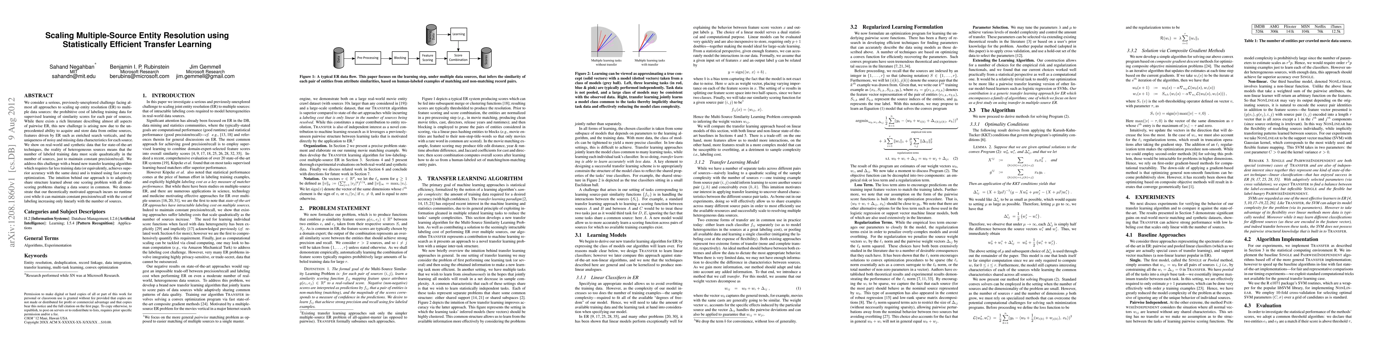 We consider a serious, previously-unexplored challenge facing almost all approaches to scaling up entity resolution (ER) to multiple data sources: the prohibitive cost of labeling training data for supervised learning of similarity scores for each pair of sources. While there exists a rich literature describing almost all aspects of pairwise ER, this new challenge is arising now due to the unprecedented ability to acquire and store data from online sources, features driven by ER such as enriched search verticals, and the uniqueness of noisy and missing data characteristics for each source. We show on real-world and synthetic data that for state-of-the-art techniques, the reality of heterogeneous sources means that the number of labeled training data must scale quadratically in the number of sources, just to maintain constant precision/recall. We address this challenge with a brand new transfer learning algorithm which requires far less training data (or equivalently, achieves superior accuracy with the same data) and is trained using fast convex optimization. The intuition behind our approach is to adaptively share structure learned about one scoring problem with all other scoring problems sharing a data source in common. We demonstrate that our theoretically motivated approach incurs no runtime cost while it can maintain constant precision/recall with the cost of labeling increasing only linearly with the number of sources.
