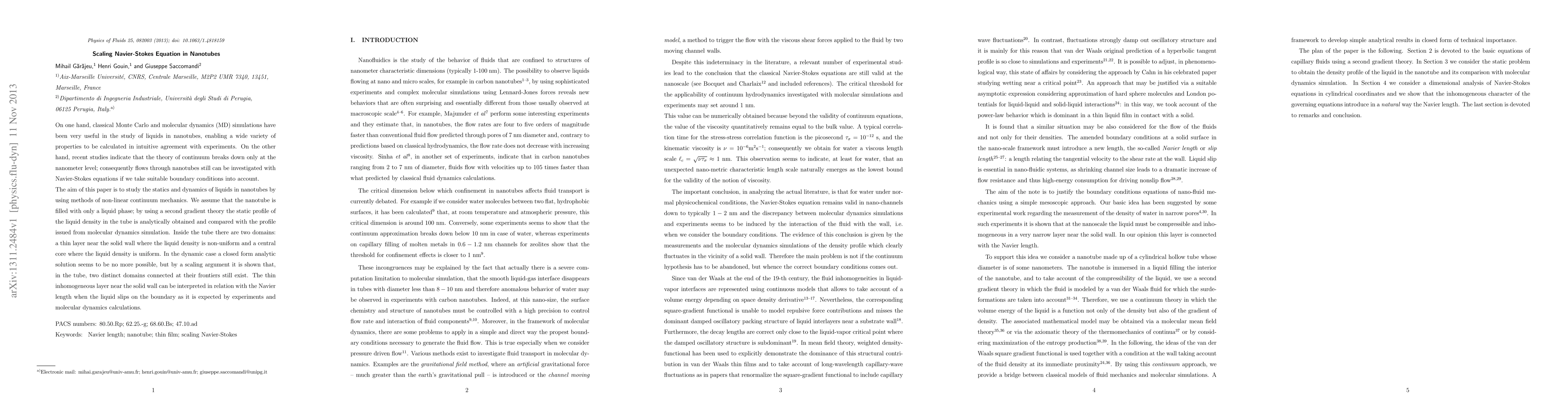 On one hand, classical Monte Carlo and molecular dynamics (MD) simulations have been very useful in the study of liquids in nanotubes, enabling a wide variety of properties to be calculated in intuitive agreement with experiments. On the other hand, recent studies indicate that the theory of continuum breaks down only at the nanometer level; consequently flows through nanotubes still can be investigated with Navier-Stokes equations if we take suitable boundary conditions into account. The aim of this paper is to study the statics and dynamics of liquids in nanotubes by using methods of non-linear continuum mechanics. We assume that the nanotube is filled with only a liquid phase; by using a second gradient theory the static profile of the liquid density in the tube is analytically obtained and compared with the profile issued from molecular dynamics simulation. Inside the tube there are two domains: a thin layer near the solid wall where the liquid density is non-uniform and a central core where the liquid density is uniform. In the dynamic case a closed form analytic solution seems to be no more possible, but by a scaling argument it is shown that, in the tube, two distinct domains connected at their frontiers still exist. The thin inhomogeneous layer near the solid wall can be interpreted in relation with the Navier length when the liquid slips on the boundary as it is expected by experiments and molecular dynamics calculations.