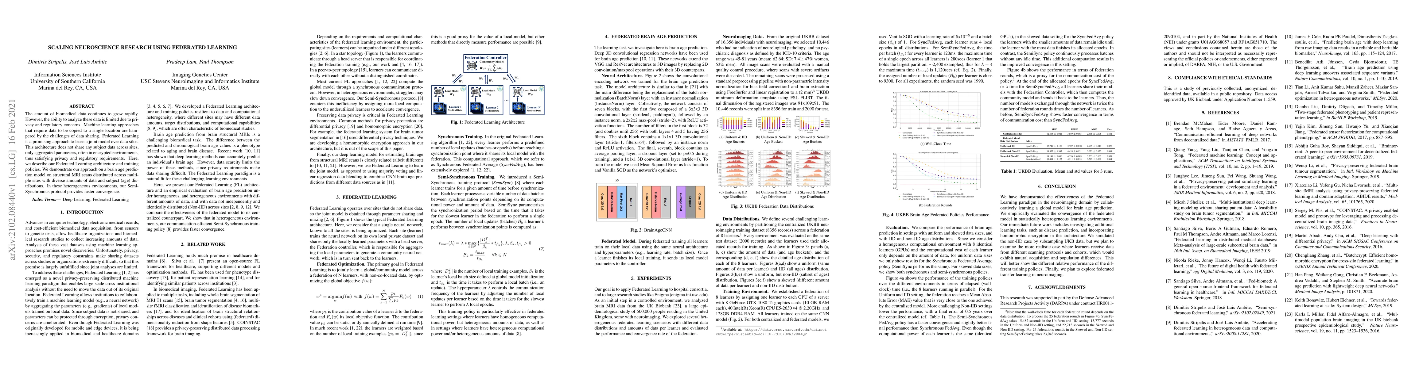 The amount of biomedical data continues to grow rapidly. However, the ability to analyze these data is limited due to privacy and regulatory concerns. Machine learning approaches that require data to be copied to a single location are hampered by the challenges of data sharing. Federated Learning is a promising approach to learn a joint model over data silos. This architecture does not share any subject data across sites, only aggregated parameters, often in encrypted environments, thus satisfying privacy and regulatory requirements. Here, we describe our Federated Learning architecture and training policies. We demonstrate our approach on a brain age prediction model on structural MRI scans distributed across multiple sites with diverse amounts of data and subject (age) distributions. In these heterogeneous environments, our Semi-Synchronous protocol provides faster convergence.