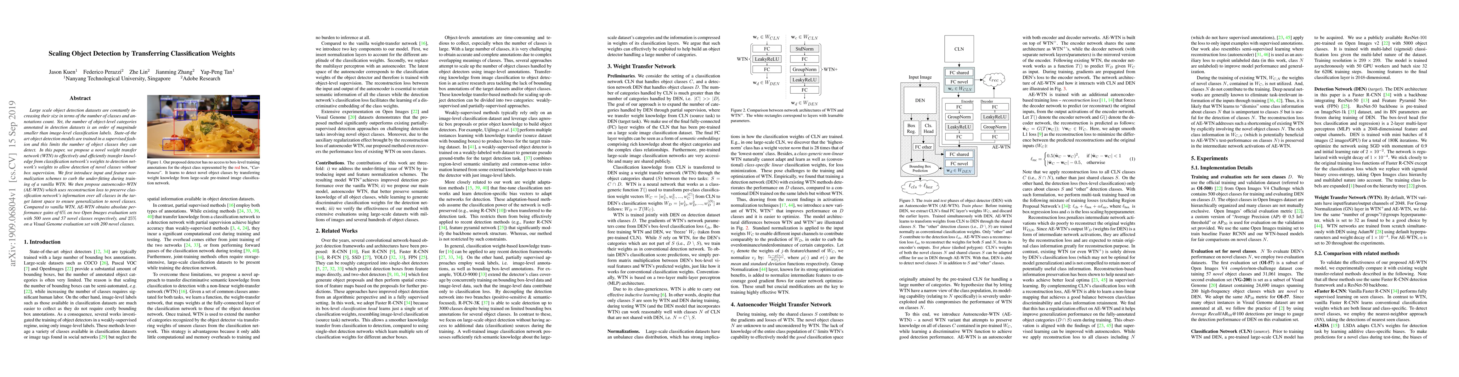 This paper introduces a Weight Transfer Network (WTN) to efficiently transfer knowledge from classification models to object detection models, enabling detection of novel classes without box supervision. An improved version, AE-WTN, uses reconstruction loss to preserve classification network information, achieving performance gains of 6% and 25% on specific datasets. Code is available at <https://github.com/xternalz/AE-WTN>.