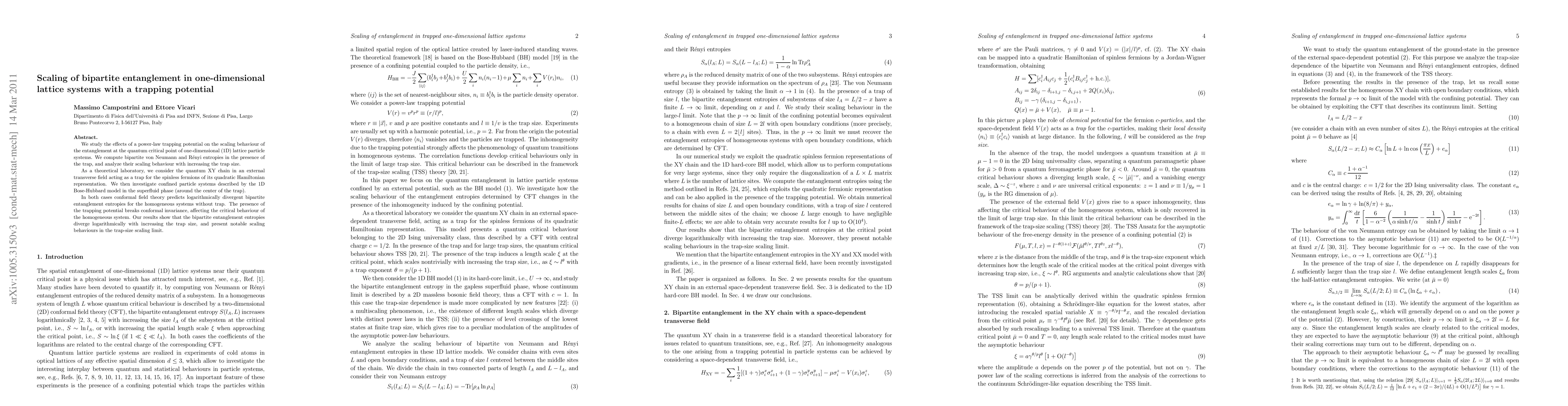 We study the effects of a power-law trapping potential on the scaling behaviour of the entanglement at the quantum critical point of one-dimensional (1D) lattice particle systems. We compute bipartite von Neumann and Renyi entropies in the presence of the trap, and analyze their scaling behaviour with increasing the trap size. As a theoretical laboratory, we consider the quantum XY chain in an external transverse field acting as a trap for the spinless fermions of its quadratic Hamiltonian representation. We then investigate confined particle systems described by the 1D Bose-Hubbard model in the superfluid phase (around the center of the trap). In both cases conformal field theory predicts logarithmically divergent bipartite entanglement entropies for the homogeneous systems without trap. The presence of the trapping potential breaks conformal invariance, affecting the critical behaviour of the homogeneous system. Our results show that the bipartite entanglement entropies diverge logarithmically with increasing the trap size, and present notable scaling behaviours in the trap-size scaling limit.