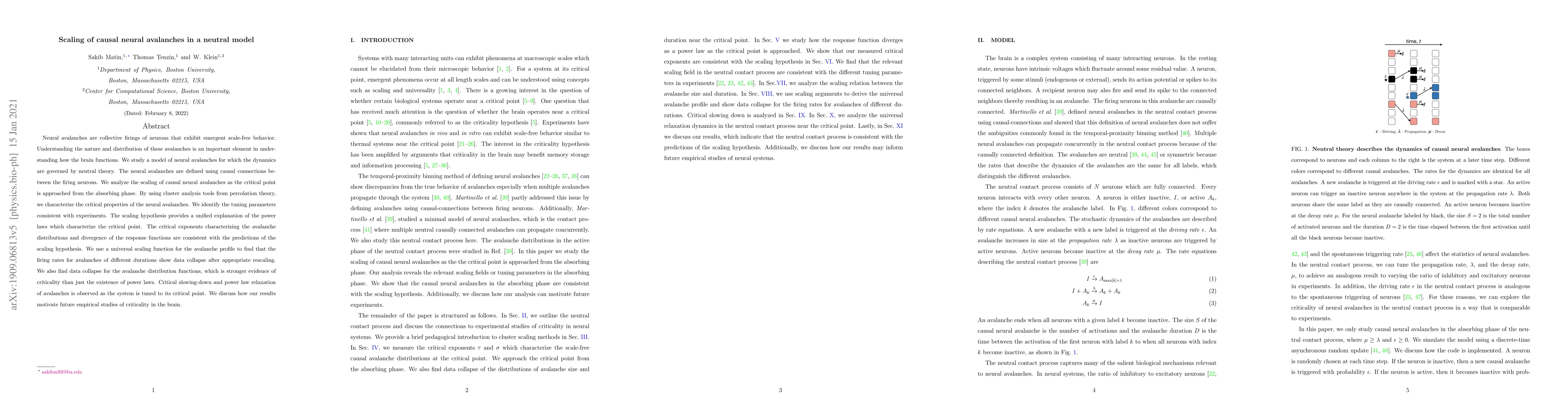 This paper explores the scaling behavior of causal neural avalanches in a neutral model, demonstrating that critical exponents and avalanche distributions follow predictions of the scaling hypothesis. The study uses cluster analysis to show data collapse, indicating criticality and motivating future empirical research on brain dynamics.