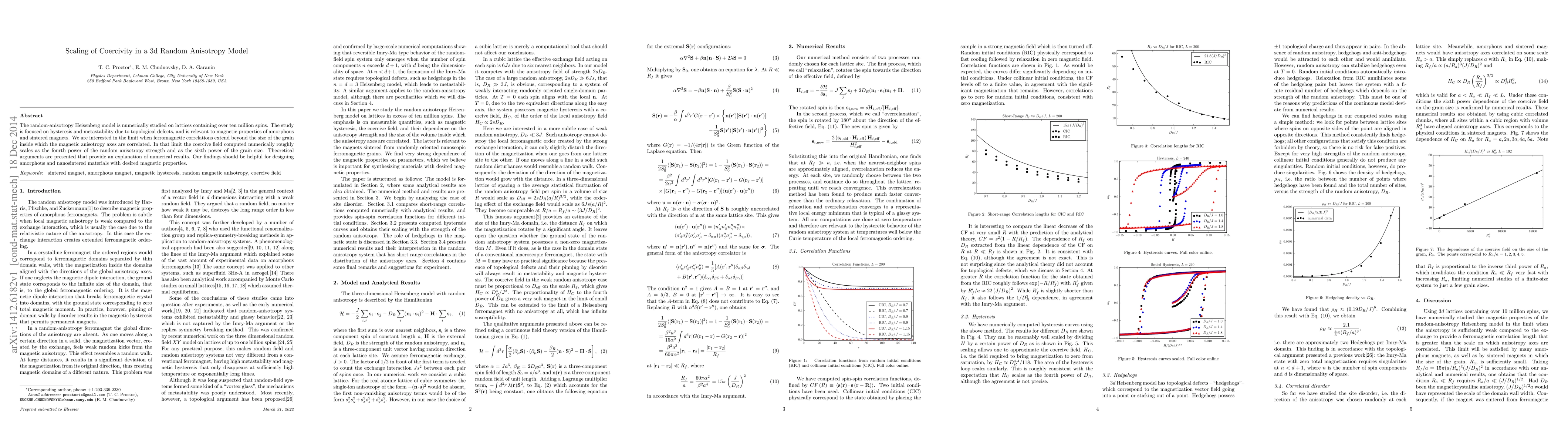 The random-anisotropy Heisenberg model is numerically studied on lattices containing over ten million spins. The study is focused on hysteresis and metastability due to topological defects, and is relevant to magnetic properties of amorphous and sintered magnets. We are interested in the limit when ferromagnetic correlations extend beyond the size of the grain inside which the magnetic anisotropy axes are correlated. In that limit the coercive field computed numerically roughly scales as the fourth power of the random anisotropy strength and as the sixth power of the grain size. Theoretical arguments are presented that provide an explanation of numerical results. Our findings should be helpful for designing amorphous and nanosintered materials with desired magnetic properties.