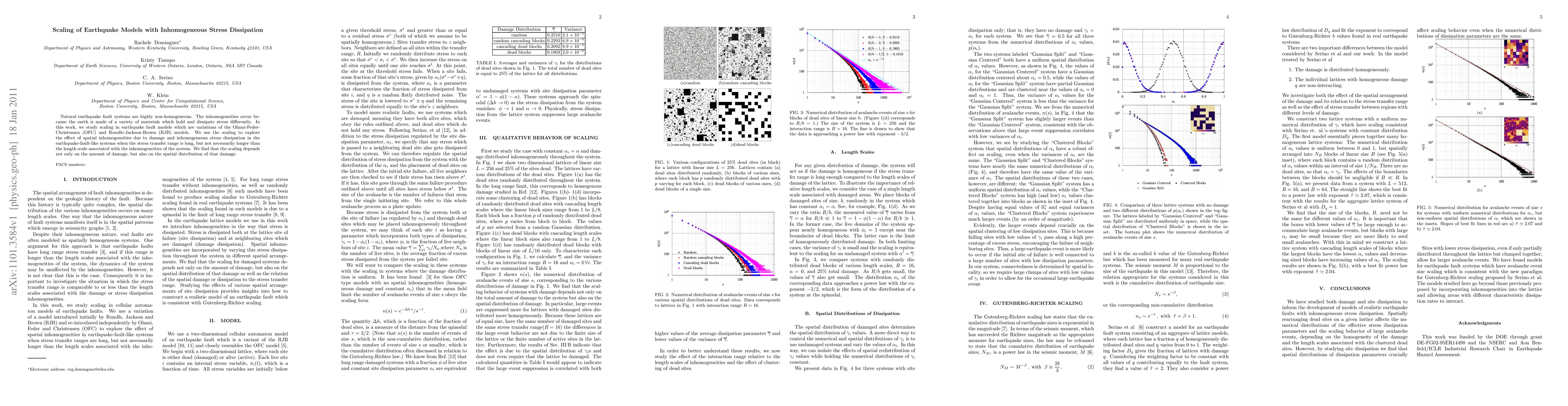 This paper investigates scaling in earthquake fault models, focusing on the Olami-Feder-Christensen and Rundle-Jackson-Brown models, to understand how spatial inhomogeneities affect stress dissipation and damage. The study finds that scaling is influenced by both the amount and distribution of damage within the fault system.