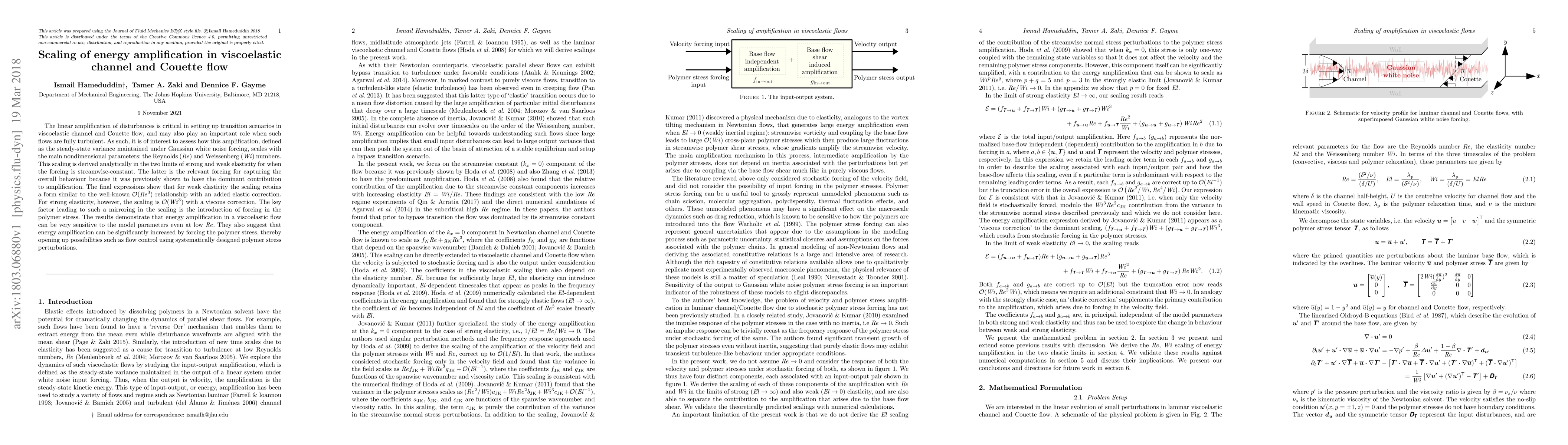 This paper analytically derives the scaling of energy amplification in viscoelastic channel and Couette flow, showing that for weak elasticity, the scaling follows an O($Re^3$) form with an elastic correction, while for strong elasticity, it scales as O($Wi^3$) with a viscous correction. The study highlights the sensitivity of energy amplification to model parameters and suggests potential for flow control via polymer stress perturbations.