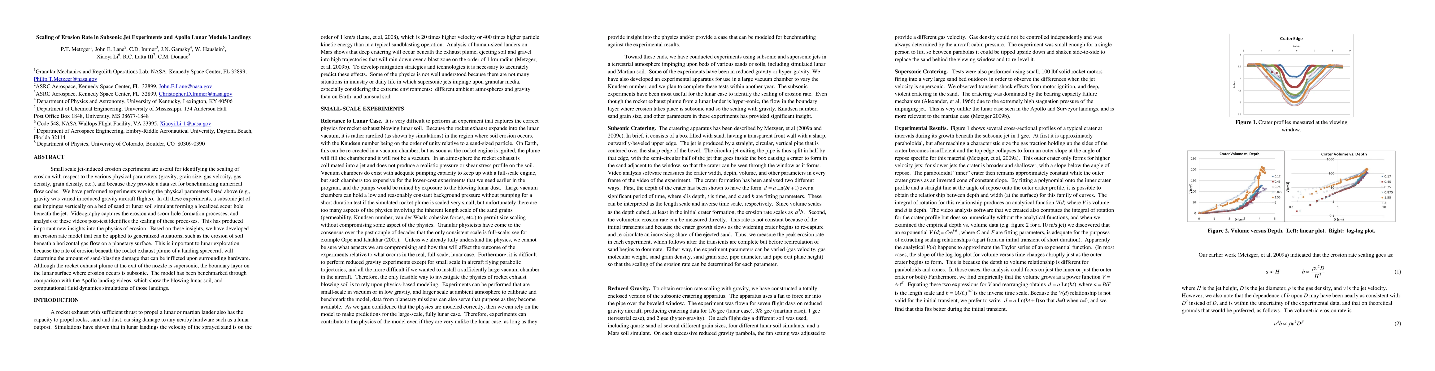 This research investigates the scaling of erosion rates in subsonic jet experiments and applies findings to lunar module landings. Experiments varying gravity, grain size, and gas flow parameters reveal key insights into erosion dynamics, leading to a generalized erosion rate model applicable to planetary surfaces. The model's accuracy is validated against Apollo landing video evidence and computational simulations.