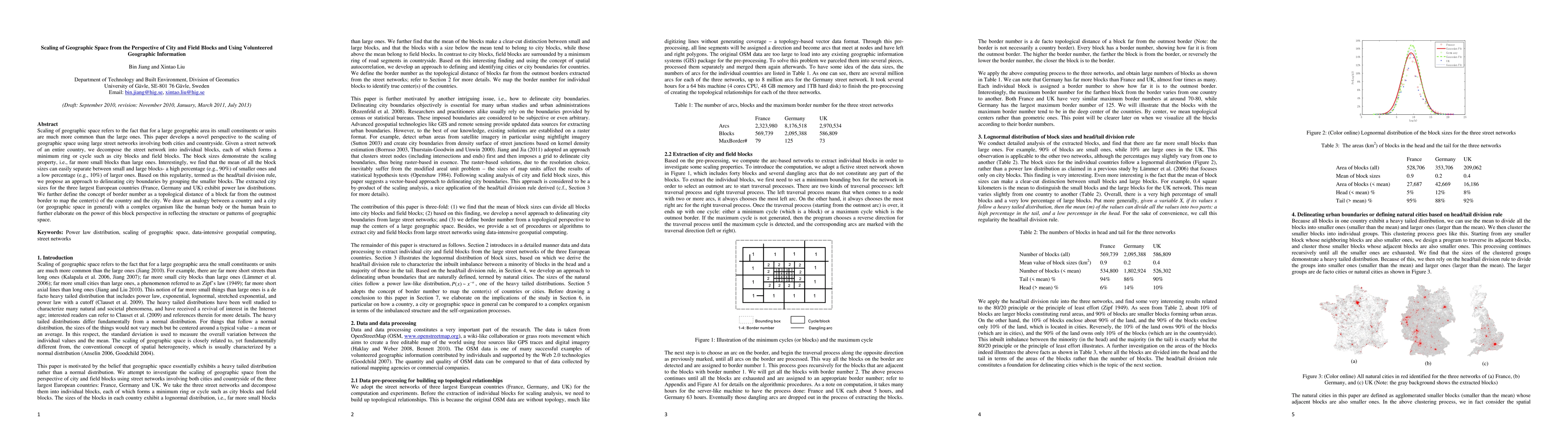 This paper explores the scaling of geographic space through street networks, demonstrating that small blocks are far more common than large ones. The study proposes a method to demarcate city boundaries using smaller blocks and finds power law distributions in city sizes for major European countries.