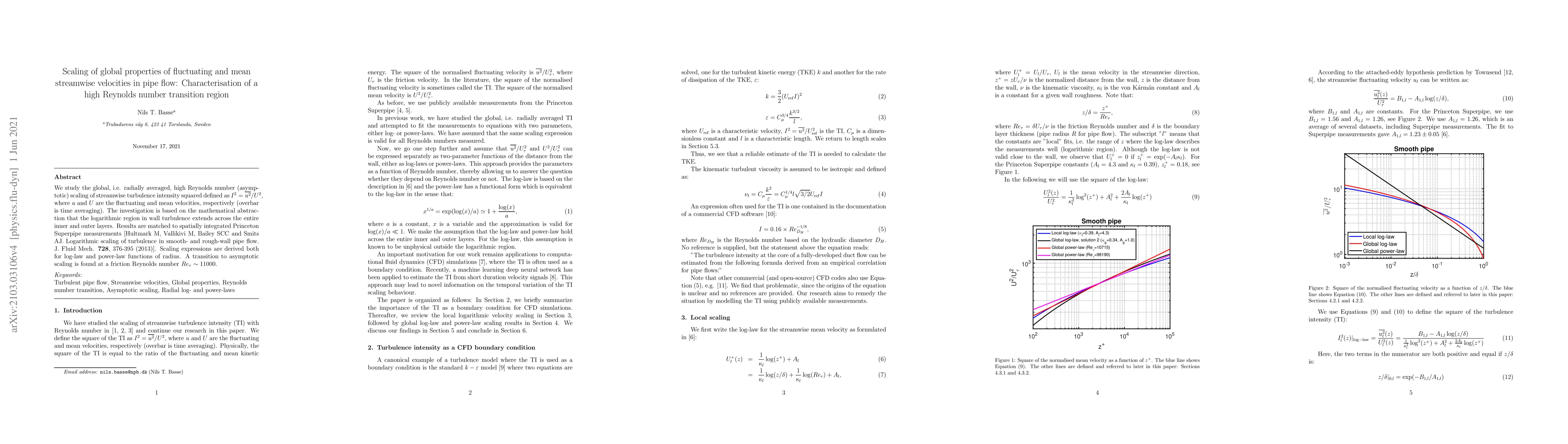 We study the global, i.e. radially averaged, high Reynolds number (asymptotic) scaling of streamwise turbulence intensity squared defined as ${I^2=\overline{u^2}/U^2}$, where $u$ and $U$ are the fluctuating and mean velocities, respectively (overbar is time averaging). The investigation is based on the mathematical abstraction that the logarithmic region in wall turbulence extends across the entire inner and outer layers. Results are matched to spatially integrated Princeton Superpipe measurements [Hultmark M, Vallikivi M, Bailey SCC and Smits AJ. Logarithmic scaling of turbulence in smooth- and rough-wall pipe flow. J. Fluid Mech. Vol. 728, 376-395 (2013)]. Scaling expressions are derived both for log-law and power-law functions of radius. A transition to asymptotic scaling is found at a friction Reynolds number $Re_{\tau} \sim 11000$.