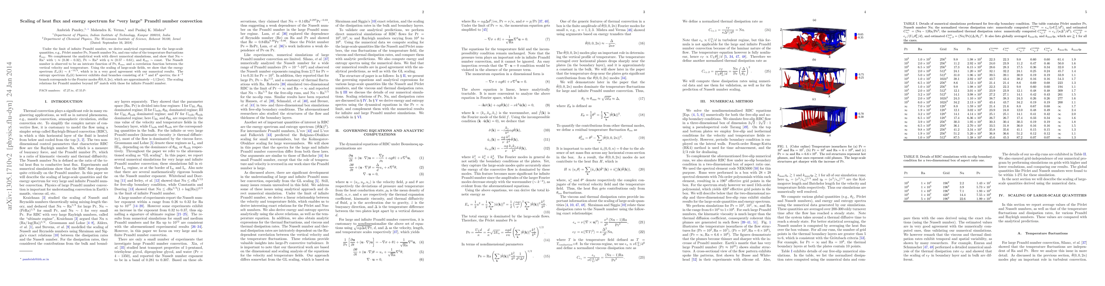 Under the limit of infinite Prandtl number, we derive analytical expressions for the large-scale quantities, e.g., P\'{e}clet number Pe, Nusselt number Nu, and rms value of the temperature fluctuations $\theta_\mathrm{rms}$. We complement the analytical work with direct numerical simulations, and show that $\mathrm{Nu} \sim \mathrm{Ra}^{\gamma}$ with $\gamma \approx (0.30-0.32)$, $\mathrm{Pe} \sim \mathrm{Ra}^{\eta}$ with $\eta \approx (0.57-0.61)$, and $\theta_\mathrm{rms} \sim \mathrm{const}$. The Nusselt number is observed to be an intricate function of $\mathrm{Pe}$, $\theta_\mathrm{rms}$, and a correlation function between the vertical velocity and temperature. Using the scaling of large-scale fields, we show that the energy spectrum $E_u(k)\sim k^{-13/3}$, which is in a very good agreement with our numerical results. The entropy spectrum $E_\theta(k)$ however exhibits dual branches consisting of $k^{-2}$ and $k^0$ spectra; the $k^{-2}$ branch corresponds to the Fourier modes $\hat{\theta}(0,0,2n)$, which are approximately $-1/(2n \pi)$. The scaling relations for Prandtl number beyond $10^2$ match with those for infinite Prandtl number.