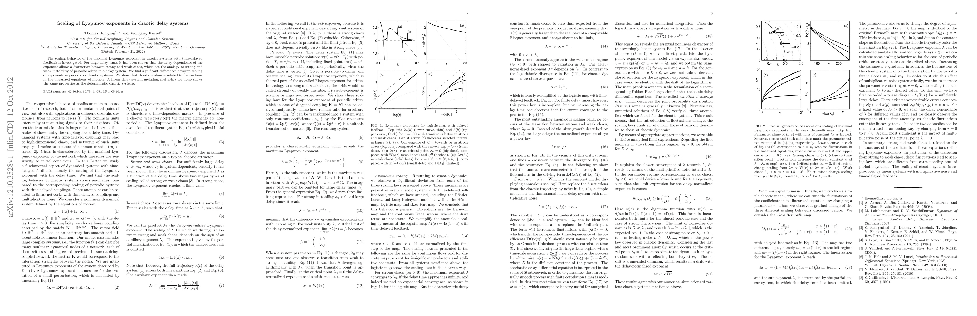 The paper investigates the scaling behavior of the maximal Lyapunov exponent in chaotic systems with time-delayed feedback, revealing significant differences in scaling between periodic and chaotic systems. Chaotic scaling is linked to fluctuations in the linearized equations of motion, with similar properties observed in linear delay systems with multiplicative noise.