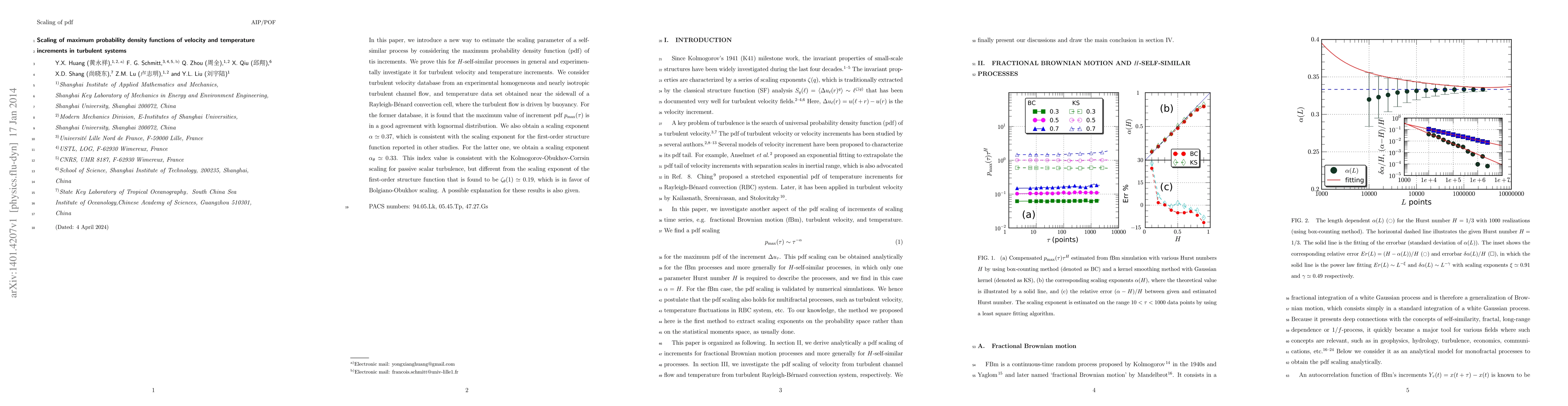 This paper proposes a novel method to estimate the scaling parameter of $H$-self-similar processes using the maximum probability density function of increments, and applies it to turbulent velocity and temperature data. The results show a lognormal distribution for velocity increments and a scaling exponent consistent with established theories, while temperature increments exhibit a different scaling exponent, suggesting distinct scaling behaviors.
