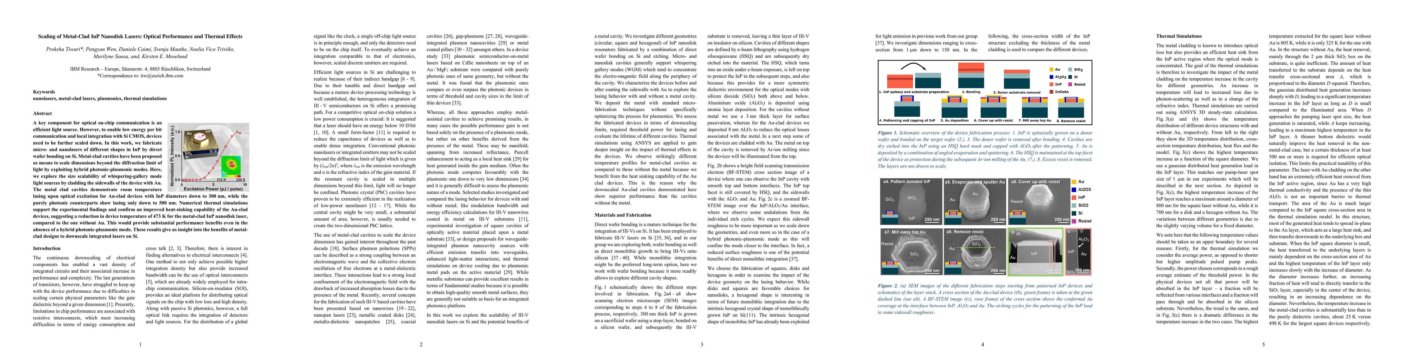 This paper investigates the optical performance and thermal effects of metal-clad InP nanodisk lasers fabricated via direct wafer bonding on Si. The study finds that metal-cladding with Au allows for lasing down to 300 nm, compared to 500 nm for purely photonic devices, and significantly reduces device temperature by 473 K, offering substantial performance benefits.
