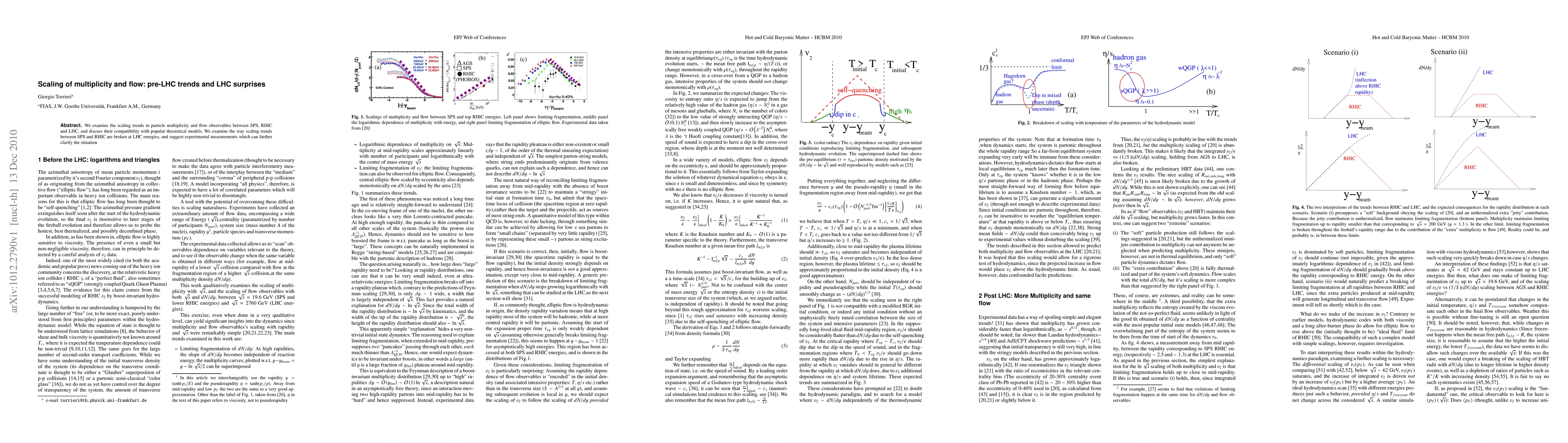 This paper investigates scaling trends in particle multiplicity and flow observables across SPS, RHIC, and LHC energies, highlighting discrepancies at LHC compared to lower energies and proposing further experimental measurements to clarify these trends.