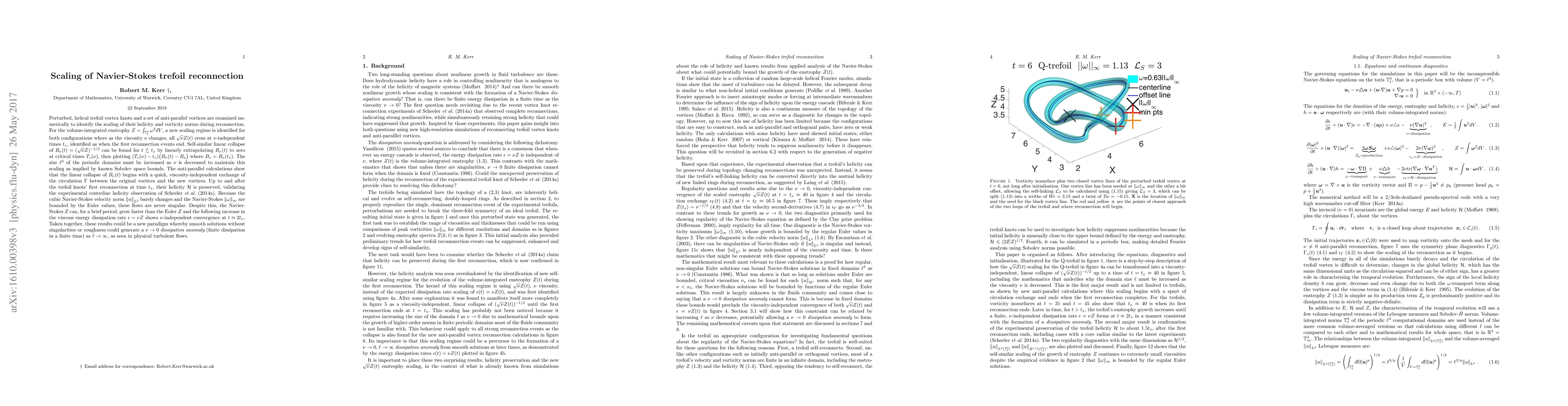 The research identifies a new scaling regime for helicity and vorticity norms during Navier-Stokes trefoil vortex reconnection, showing that volume-integrated enstrophy crosses at $ u$-independent times. It reveals self-similar linear collapse of certain parameters and preservation of helicity up to first reconnection, indicating smooth solutions without singularities can generate a dissipation anomaly similar to physical turbulent flows as viscosity approaches zero.