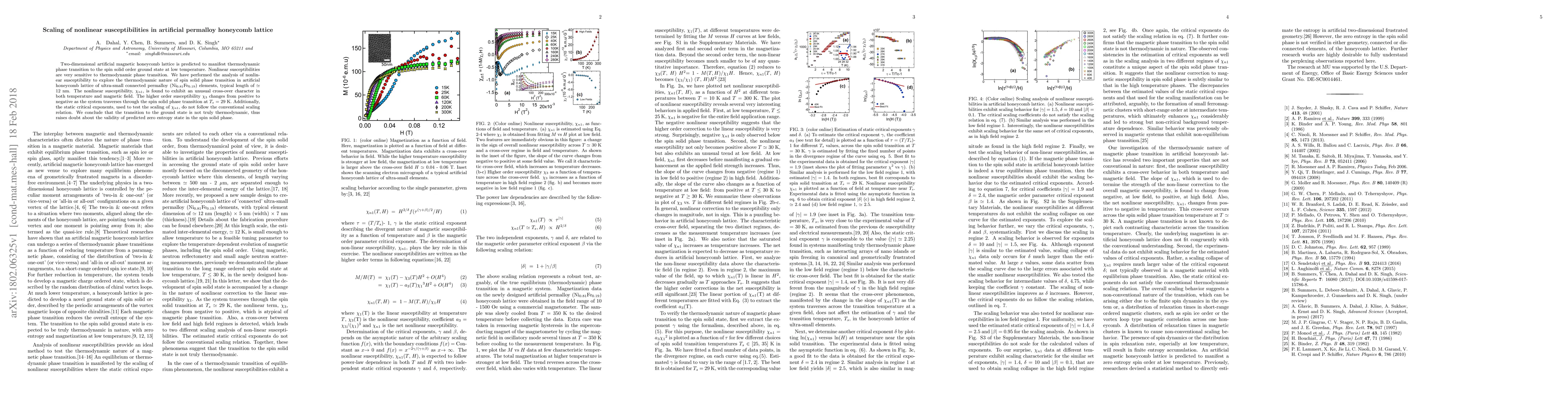 This study investigates nonlinear susceptibilities in an artificial permalloy honeycomb lattice, revealing unusual cross-over behavior and a change in higher-order susceptibility during a phase transition. The findings suggest the transition may not be thermodynamic, questioning the predicted zero entropy state in the spin solid phase.