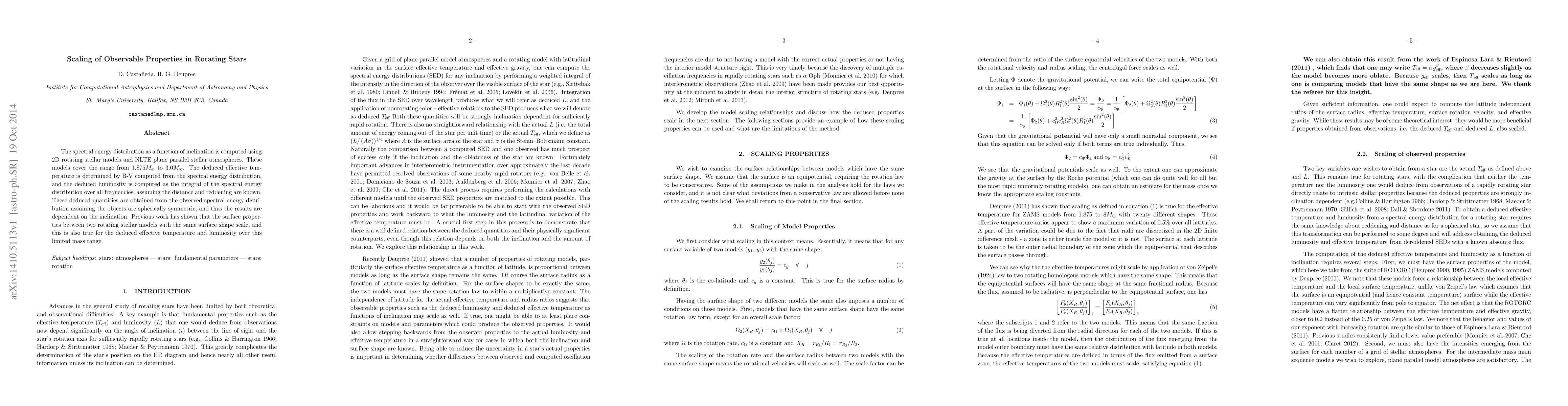 The spectral energy distribution as a function of inclination is computed using 2D rotating stellar models and NLTE plane parallel stellar atmospheres. These models cover the range from $1.875M_{\odot}$ to $3.0M_{\odot}$. The deduced effective temperature is determined by B-V computed from the spectral energy distribution, and the deduced luminosity is computed as the integral of the spectral energy distribution over all frequencies, assuming the distance and reddening are known. These deduced quantities are obtained from the observed spectral energy distribution assuming the objects are spherically symmetric, and thus the results are dependent on the inclination. Previous work has shown that the surface properties between two rotating stellar models with the same surface shape scale, and this is also true for the deduced effective temperature and luminosity over this limited mass range.