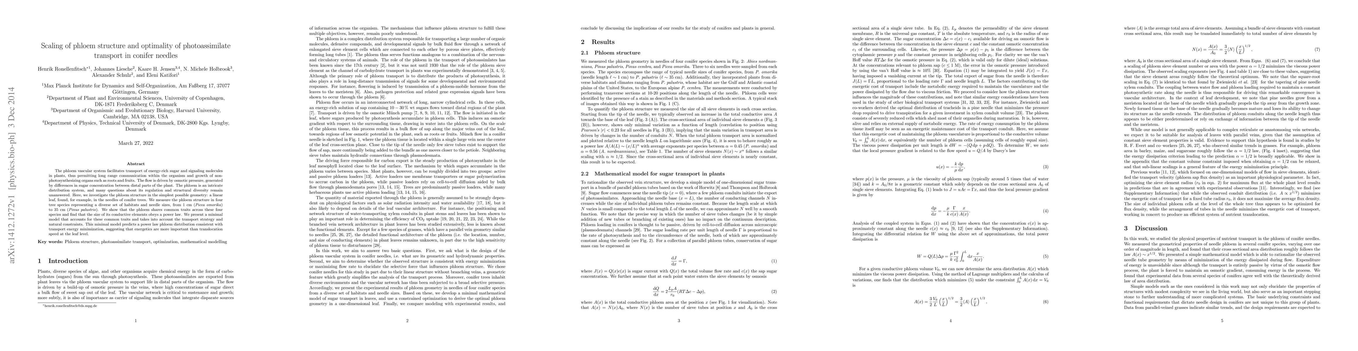 The phloem vascular system facilitates transport of energy-rich sugar and signaling molecules in plants, thus permitting long range communication within the organism and growth of non-photosynthesizing organs such as roots and fruits. The flow is driven by osmotic pressure, generated by differences in sugar concentration between distal parts of the plant. The phloem is an intricate distribution system, and many questions about its regulation and structural diversity remain unanswered. Here, we investigate the phloem structure in the simplest possible geometry: a linear leaf, found, for example, in the needles of conifer trees. We measure the phloem structure in four tree species representing a diverse set of habitats and needle sizes, from 1 cm (\textit{Picea omorika}) to 35 cm (\textit{Pinus palustris}). We show that the phloem shares common traits across these four species and find that the size of its conductive elements obeys a power law. We present a minimal model that accounts for these common traits and takes into account the transport strategy and natural constraints. This minimal model predicts a power law phloem distribution consistent with transport energy minimization, suggesting that energetics are more important than translocation speed at the leaf level.