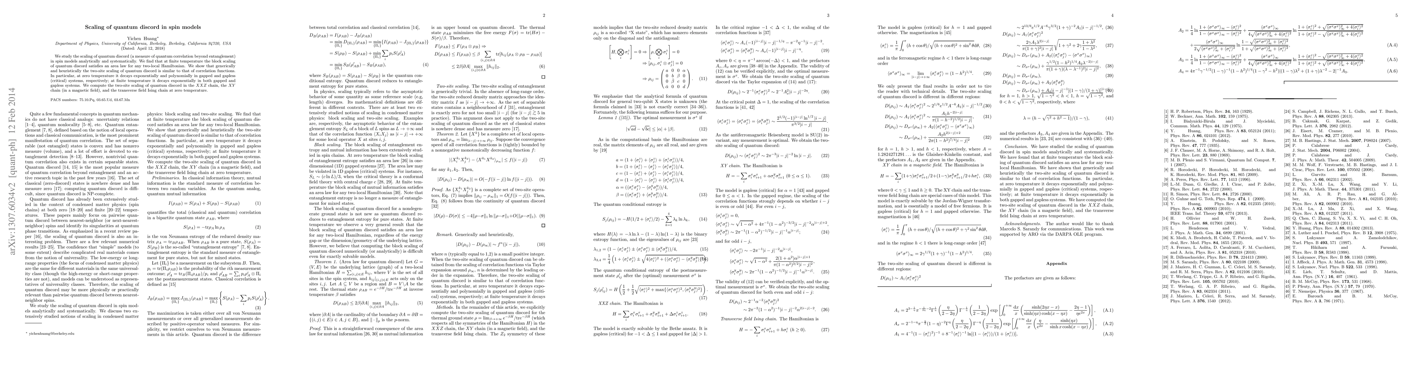 We study the scaling of quantum discord (a measure of quantum correlation beyond entanglement) in spin models analytically and systematically. We find that at finite temperature the block scaling of quantum discord satisfies an area law for any two-local Hamiltonian. We show that generically and heuristically the two-site scaling of quantum discord is similar to that of correlation functions. In particular, at zero temperature it decays exponentially and polynomially in gapped and gapless (critical) systems, respectively; at finite temperature it decays exponentially in both gapped and gapless systems. We compute the two-site scaling of quantum discord in the XXZ chain, the XY chain (in a magnetic field), and the transverse field Ising chain at zero temperature.